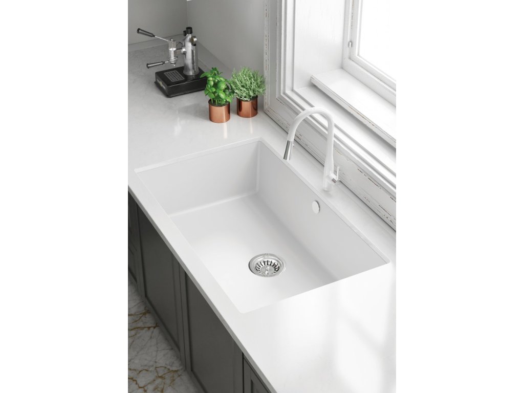 Granitový dřez Deante je vyroben z nejkvalitnějšího přírodního granitového kompozitu. Ne nadarmo má 18letou záruku výrobce. Vyznačuje se odolností proti nárazům, vysokým teplotám a náhlým změnám teplot, v souladu s evropskou normou PN-EN 13310. Moderní povrch nebledne ani neztrácí lesk. Skvěle se hodí k dřevěným a kamenným pracovním deskám. Elegantní dřez s 1 mísou je perfektním řešením pro malé kuchyně a studia s kuchyňským koutem. Výrobek visí pod pracovní deskou. Díky tomu komora zapuštěná do kuchyňské skříňky nevyčnívá nad povrch.- Vlastnosti žuly Deante: odolnost proti nárazu, vysoké teplotě, změně barvy, tepelnému šoku