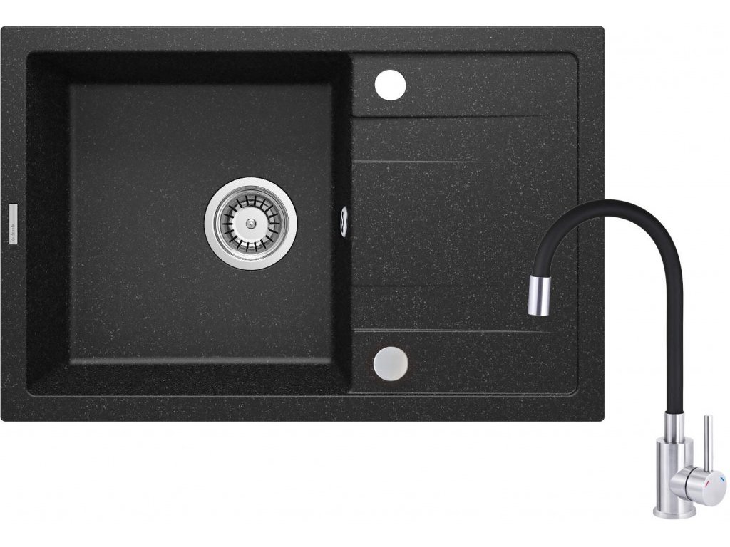 Granitový dřez s baterií tvoří kompletní kuchyňskou sestavu. Byla vyrobena z odolné přírodní žuly, která je odolná nejen vůči vysoké teplotě a jejím výkyvům, ale i nárazům a změně barvy, v souladu s evropskou normou PN-EN 13310. Navíc je obohacena o hydrofobní vrstvu, která usnadňuje tok jednotlivých kapek. Ve stejné barvě je i vodovodní baterie s pohodlnou výlevkou. Jedná se o model s praktickým, flexibilním výtokem. Přepad v komoře chrání pracovní desku a kuchyň před zatopením. Přebytečná voda je efektivně odváděna do sifonu.