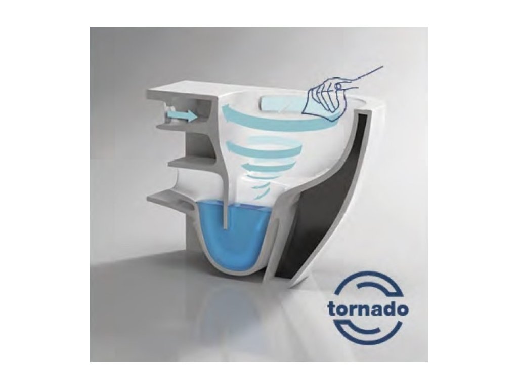 Patentovaný systém Tornado s tryskou čistí celý vnútorný priestor s doposiaľ nevídanou dôkladnosťou . Voda pod tlakom z trysky preniká vírivým pohybom do každého záhybu misy . Tento systém splachovania je nielen podstatne účinnejší ako bežné spádové splachovanie, ale aj tichšie a úspornejšie . Tradičné WC záchody majú pod okrajom veľmi ťažko prístupné miesta, v ktorých sa zhromažďujú nečistoty a baktérie. S inovatívnou technológiou TORNADO bol tento problém vyriešený – zo záchodovej misy bol odstránený vnútorný „golier“ a teda aj ťažko prístupné miesta. Teraz pri splachovaní voda oplachuje všetky vnútorné plochy misy a ľahko sa tiež dostane ku všetkým vnútorným plochám, misa je tak vždy dokonale čistá.