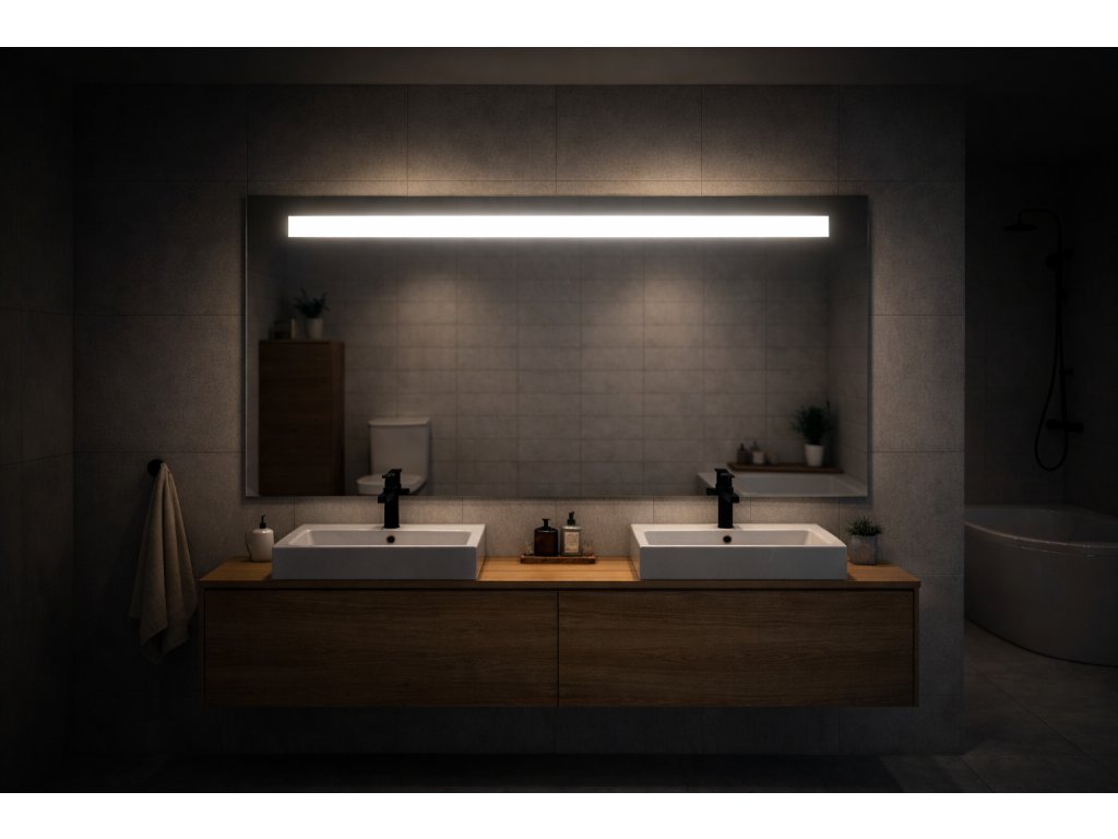 Pri montáži 100 cm zrkadla dbajte na presné vycentrovanie voči dvojumývadlu. Nezabudnite ponechať dostatočný priestor pod zrkadlom (cca 20–30 cm), aby spodné podsvietenie mohlo vytvoriť ideálny svetelný kužeľ nad oboma batériami a plochou umývadla.