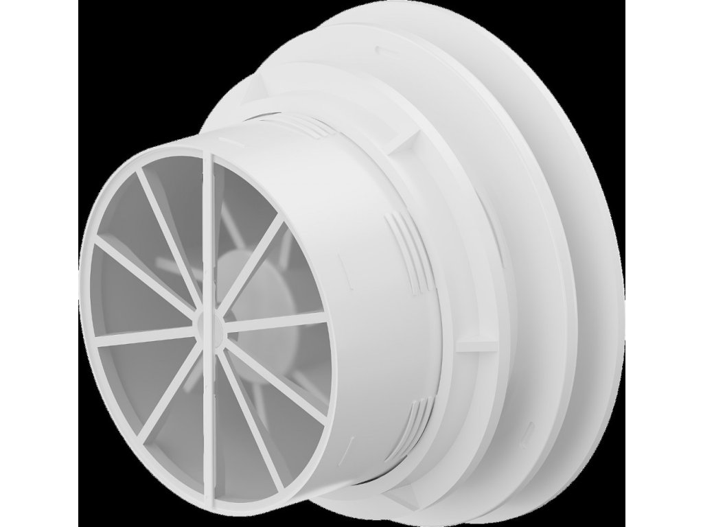 - Zpětná klapka, která zabraňuje proudění vzduchu zpět do místnosti z ventilačního potrubí