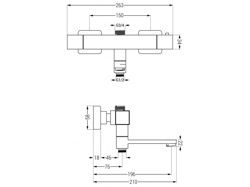 Připojení sprchy: G 3/4 "(nahoře) a G 1/2" (dole)