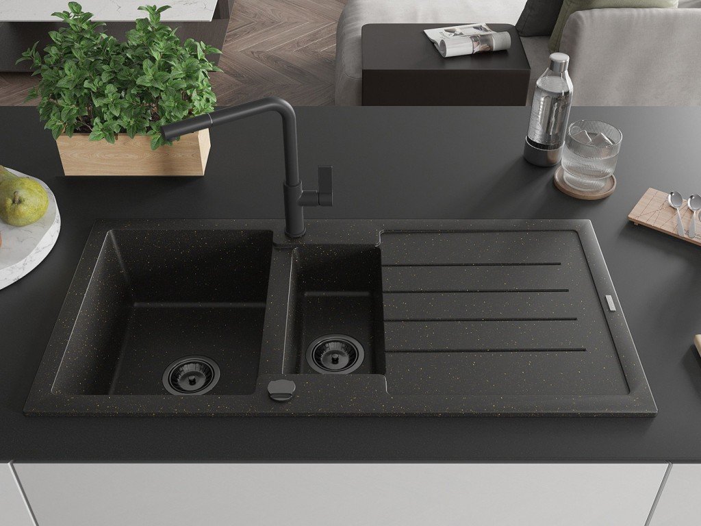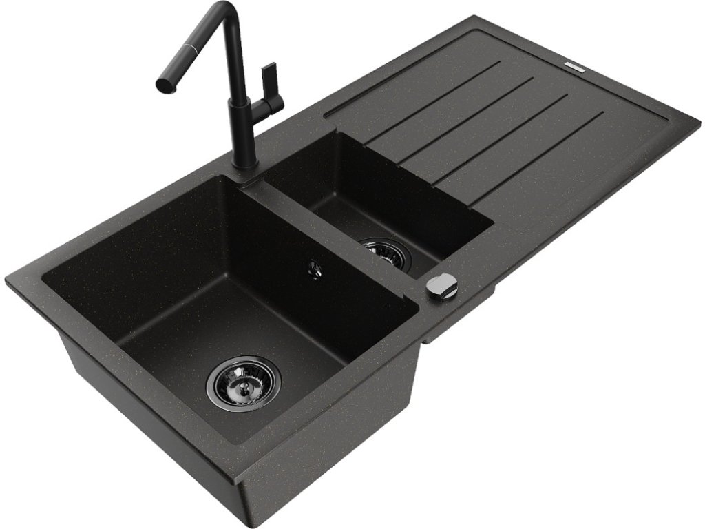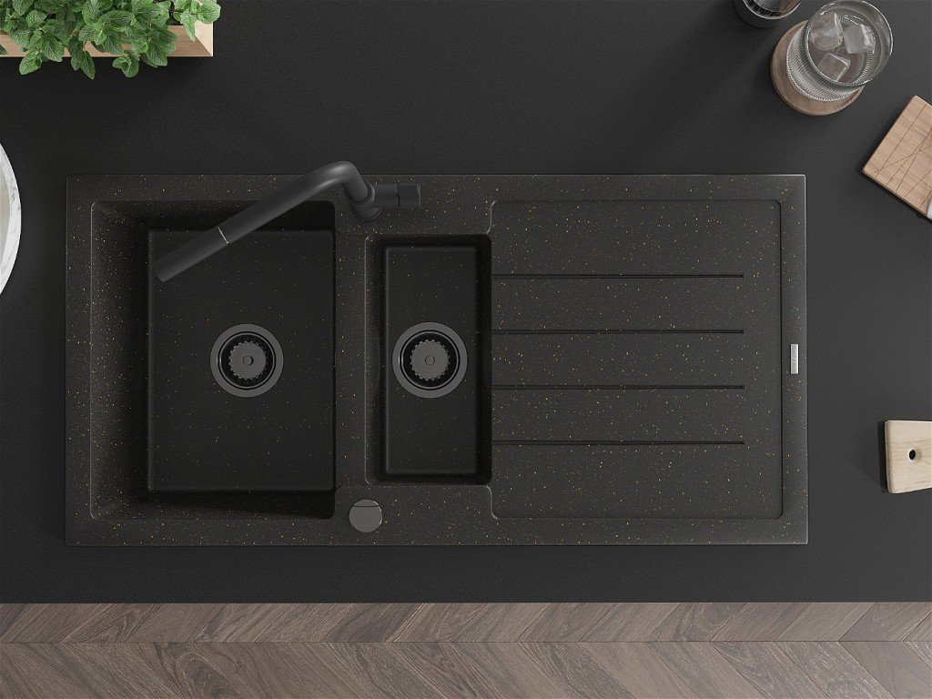 MEXEN/S - Andres granitový dřez s odkapávačem včetně baterie Flora, černá/zlatá 6515-75-670401-70-B