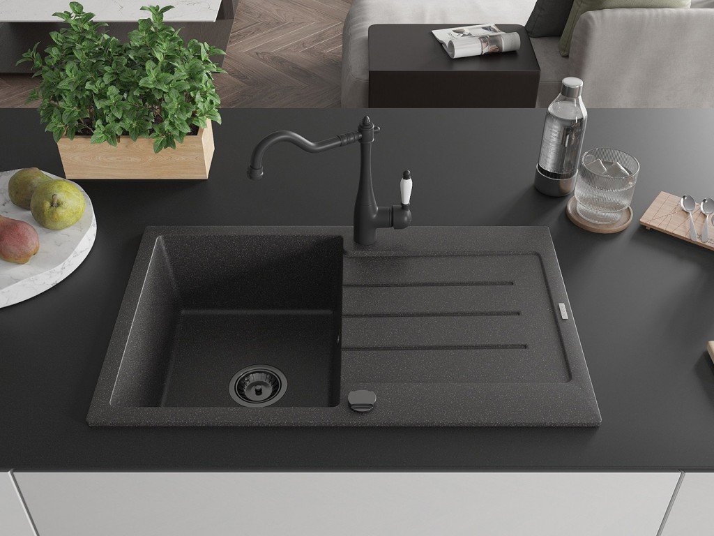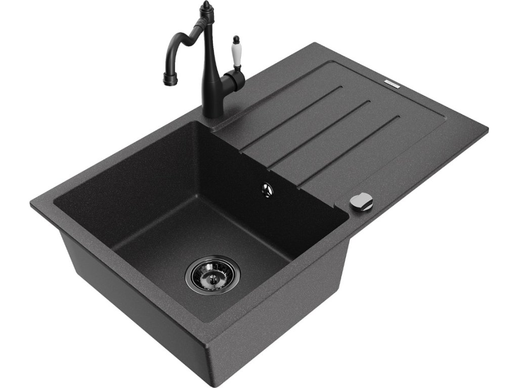 MEXEN/S - Bruno granitový dřez 1-miska s odkapávačem včetně baterie Carla, černá kropenatá 6513-76-670700-70-B