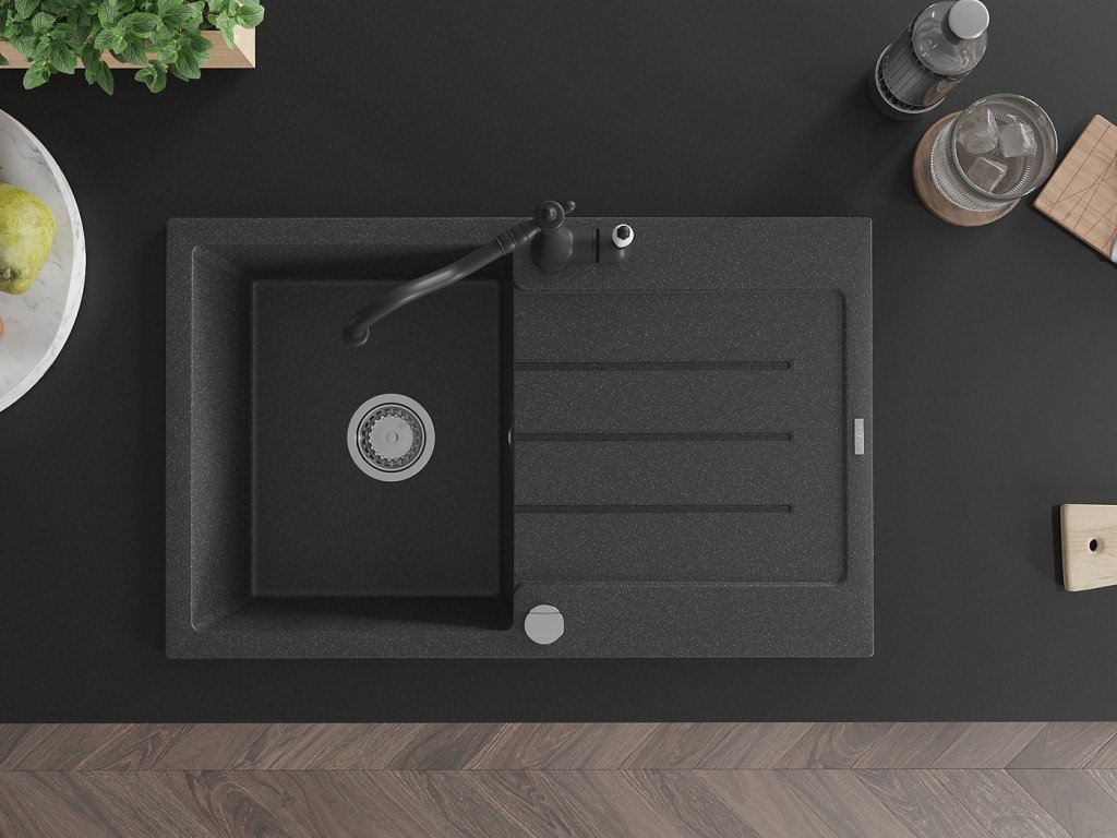MEXEN/S - Bruno granitový dřez 1-miska s odkapávačem včetně baterie Carla, černá kropenatá 6513-76-670700-70