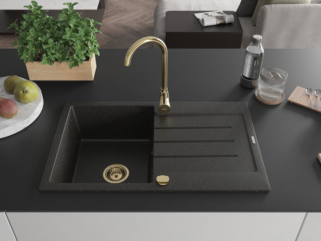 MEXEN/S - Bruno granitový dřez 1 s odkapávačem 795x495 mm, černá/zlatý metalik, + zlatý sifon 6513791010-75-G
