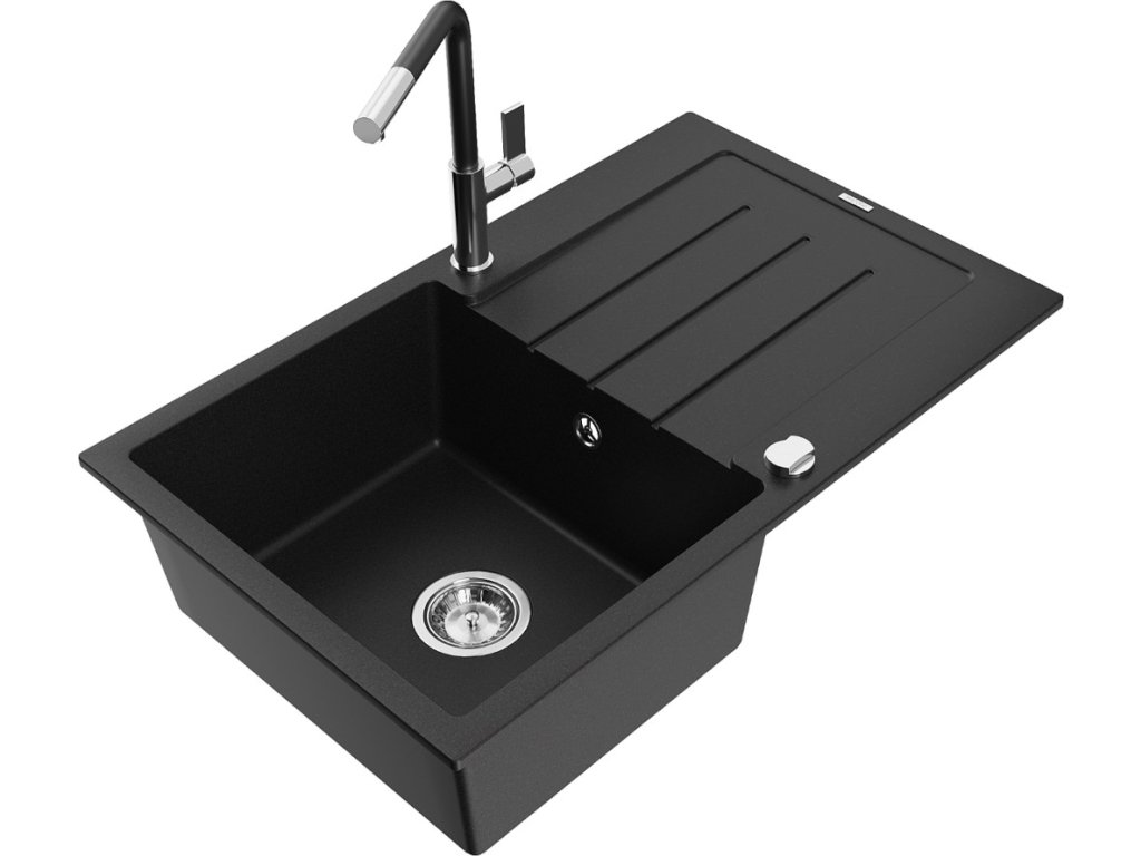 MEXEN/S - Bruno granitový dřez 1 s odkapávačem včetně baterie Flora, černá 6513-77-670401-07