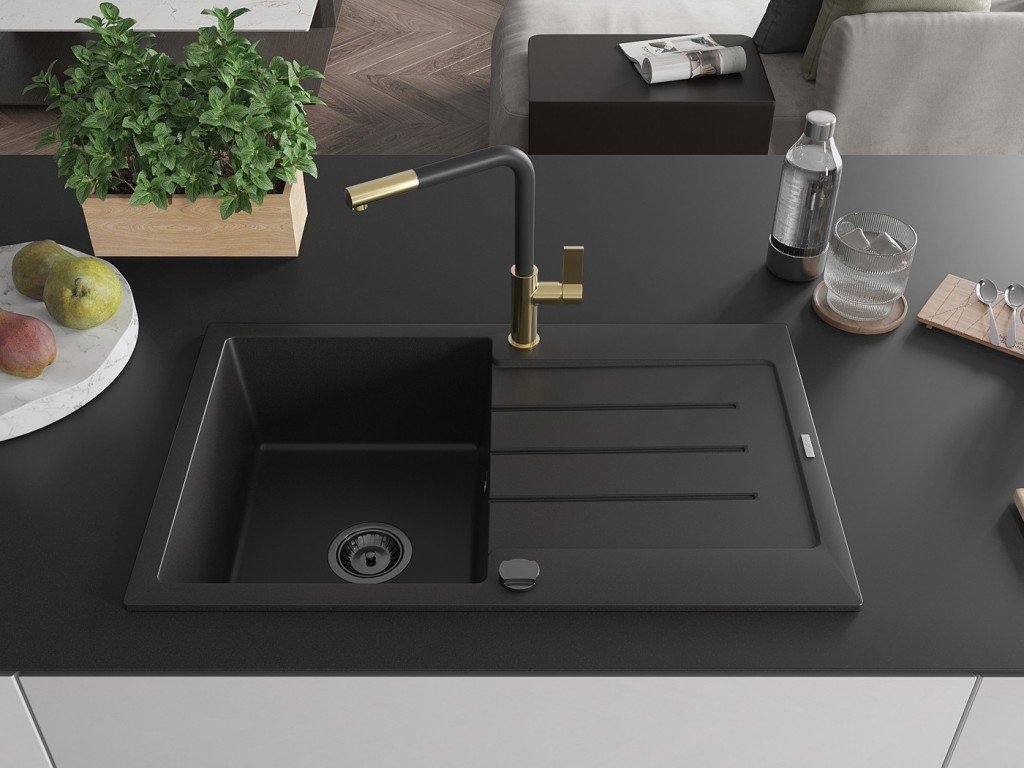 MEXEN/S - Bruno granitový dřez 1 s odkapávačem včetně baterie Flora, černá 6513-77-670401-57-B