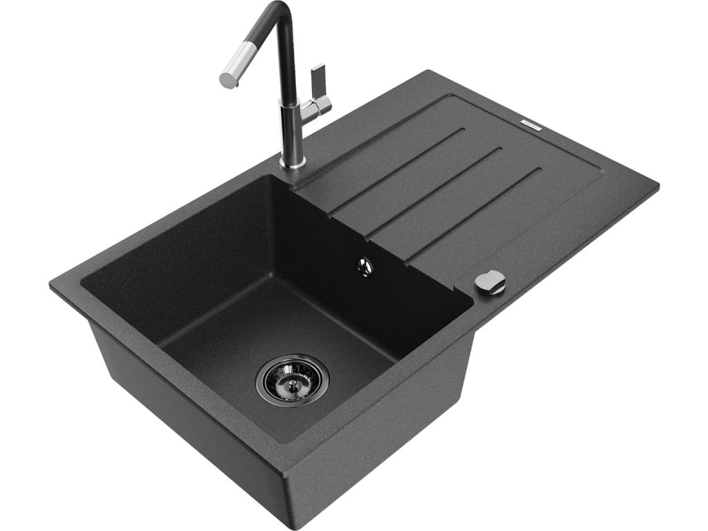 MEXEN/S - Bruno granitový dřez 1 s odkapávačem včetně baterie Flora, černá kropenatá 6513-76-670401-07-B