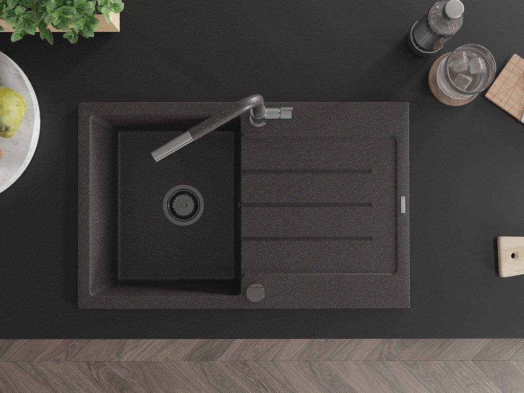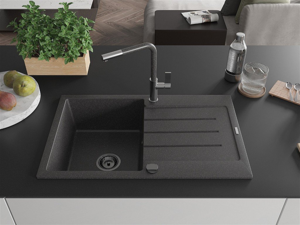 MEXEN/S - Bruno granitový dřez 1 s odkapávačem včetně baterie Flora, černá kropenatá 6513-76-670401-08-B