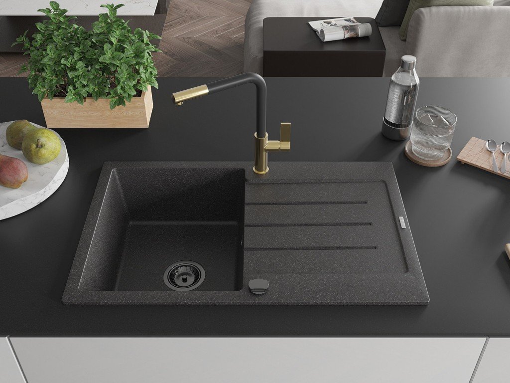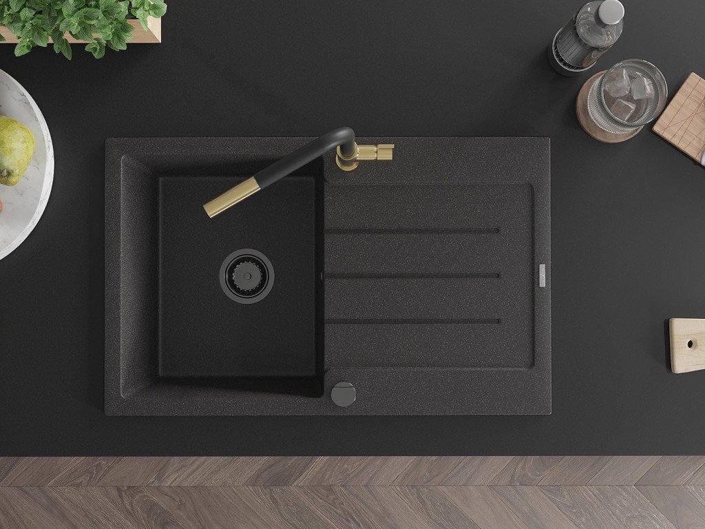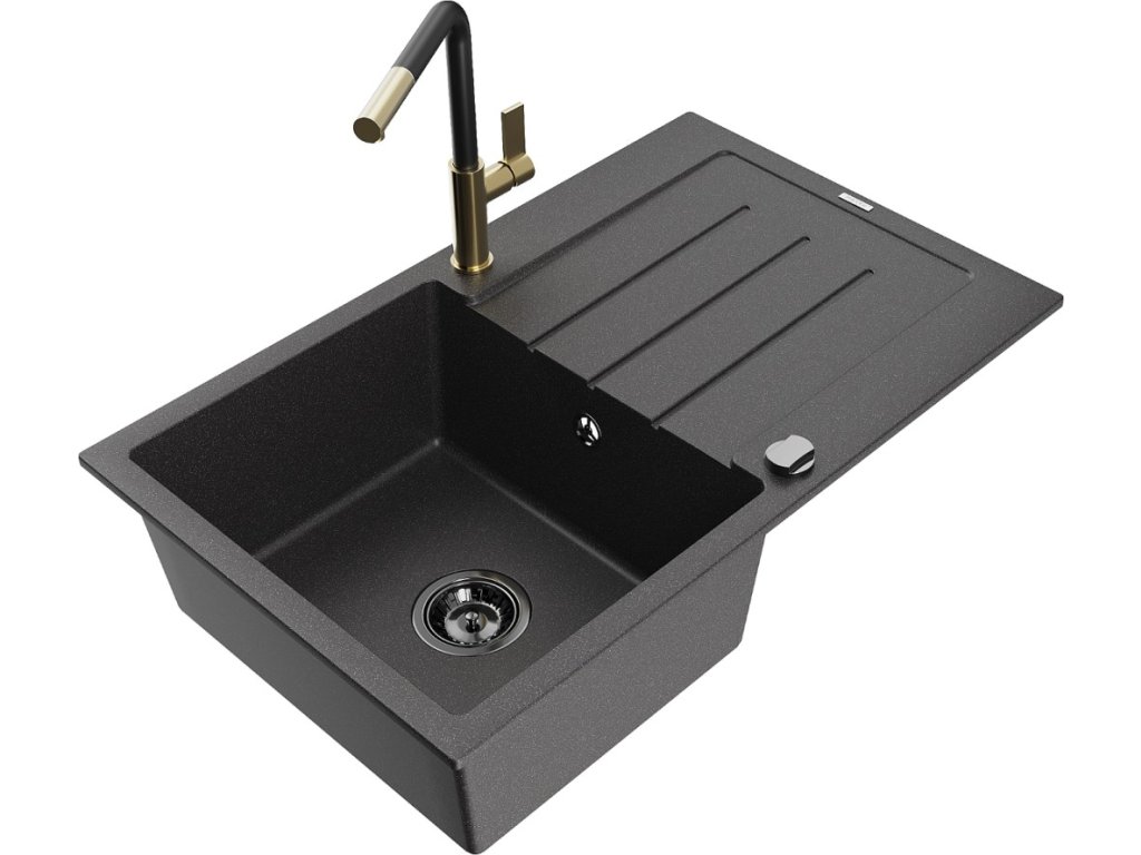 MEXEN/S - Bruno granitový dřez 1 s odkapávačem včetně baterie Flora, černá kropenatá 6513-76-670401-57-B