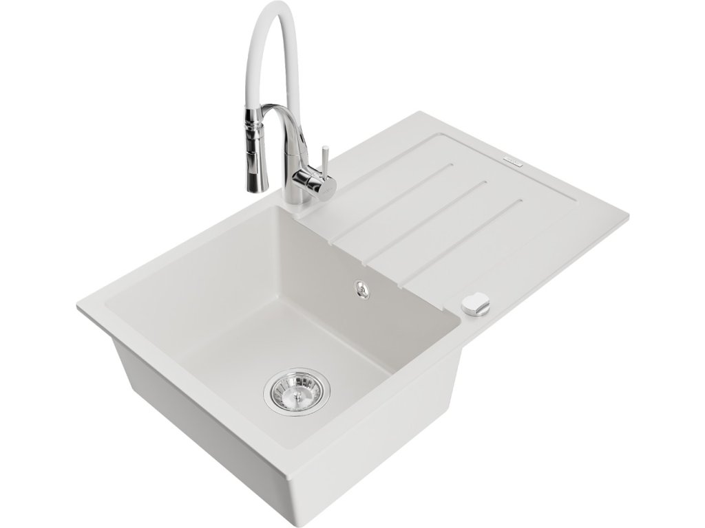 MEXEN/S - Bruno granitový dřez s odkapávačem včetně baterie Aster, bílá 6513-20-73450-02