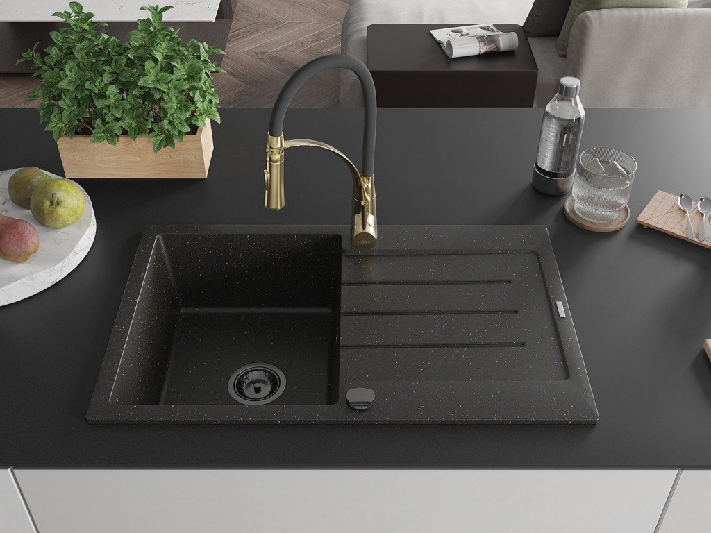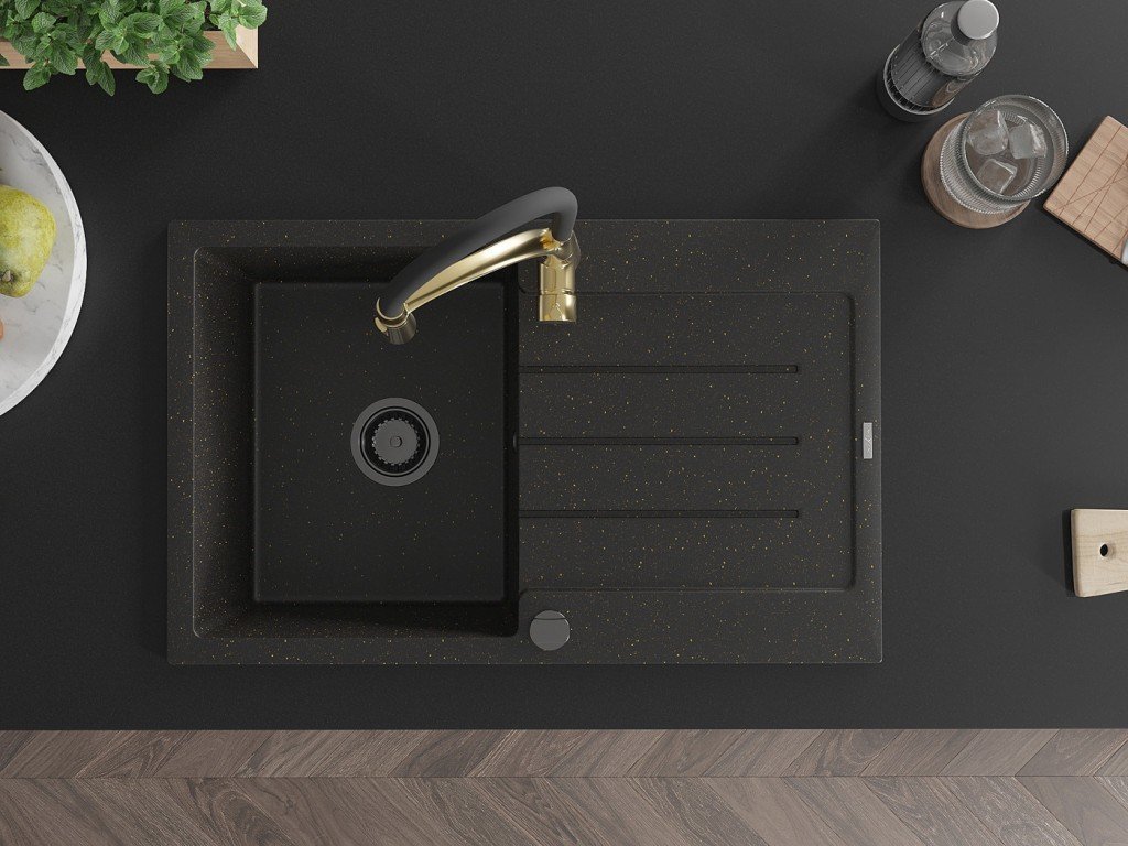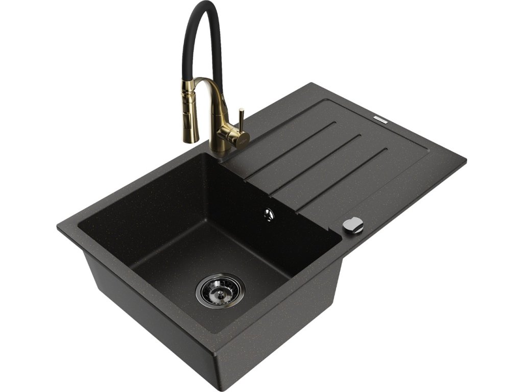 MEXEN/S - Bruno granitový dřez s odkapávačem včetně baterie Aster, černá/zlatá metalik 6513-75-73450-57-B