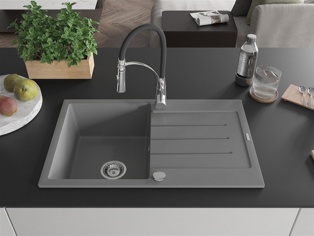 MEXEN/S - Bruno granitový dřez s odkapávačem včetně baterie Aster, šedá 6513-71-73450-07