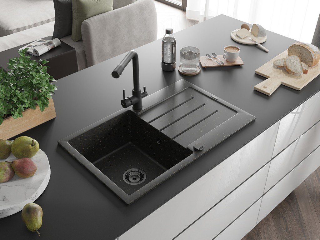 MEXEN/S - Bruno granitový dřez s odkapávačem včetně baterie Duero, černá/zlatá metalik 6513-75-671600-70-B