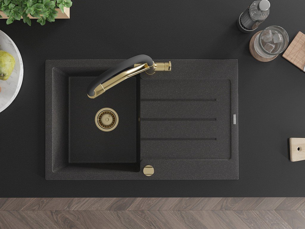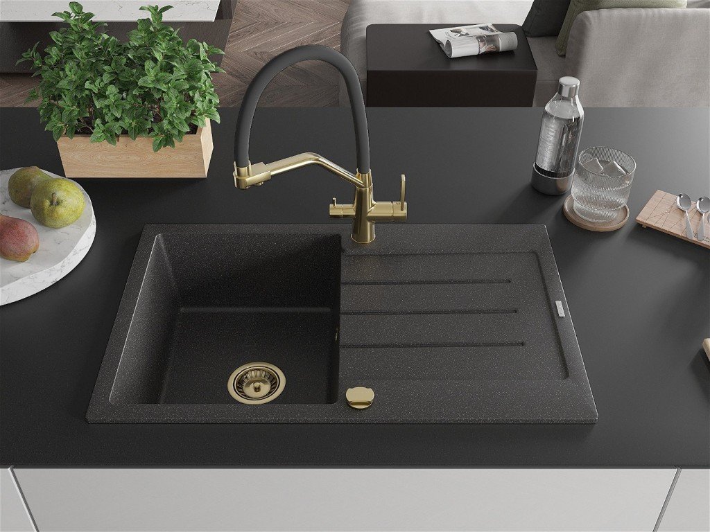 MEXEN/S - Bruno granitový dřez s odkapávačem včetně baterie Duo, černá kropenatá 6513-76-671701-57-G