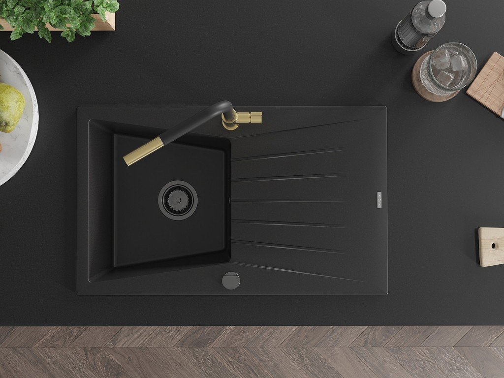 MEXEN/S - Cesar granitový dřez 1-miska s odkapávačem včetně baterie Flora, černá 6514-77-670401-57-B