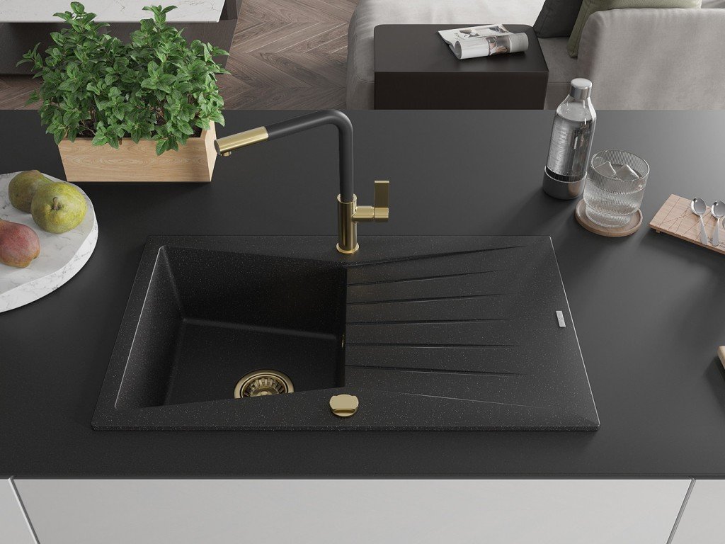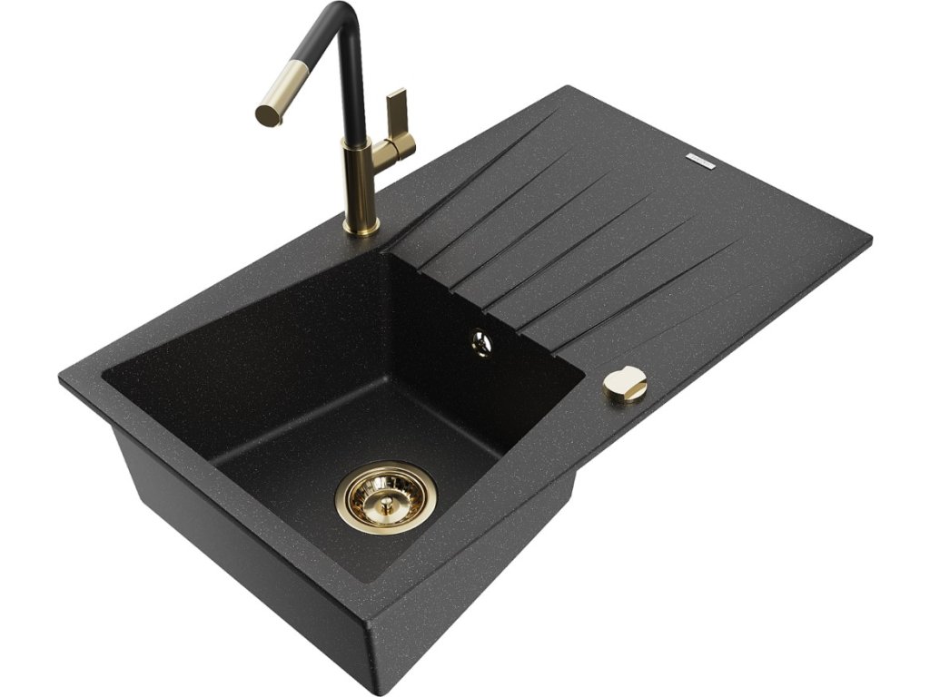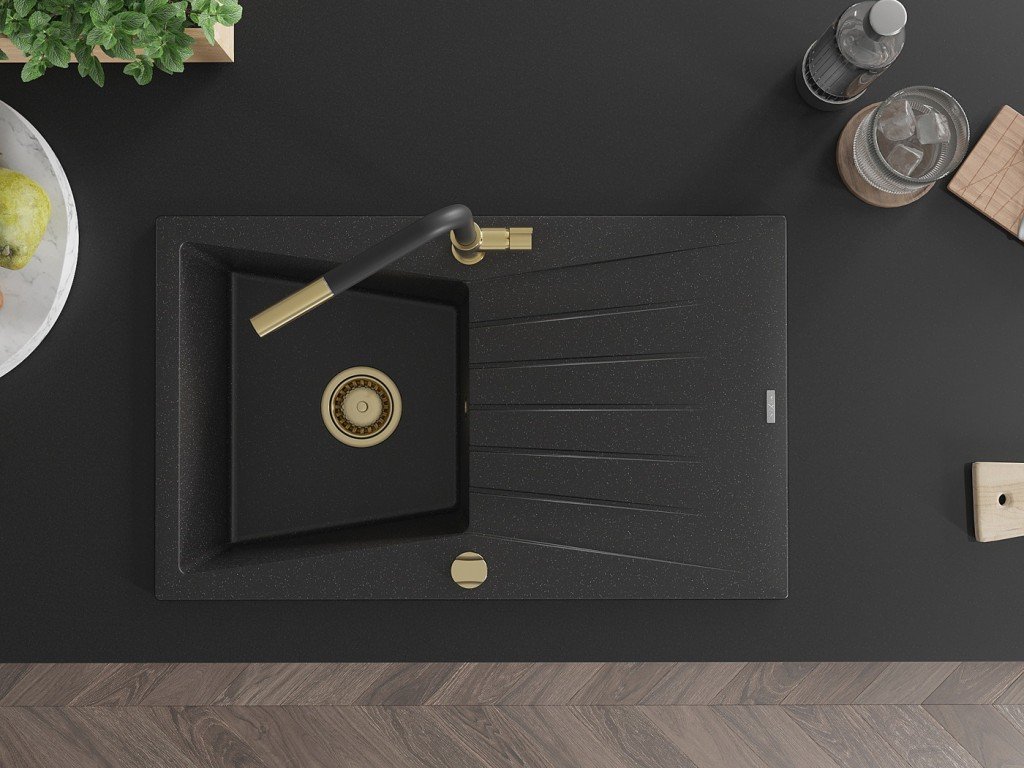 MEXEN/S - Cesar granitový dřez 1-miska s odkapávačem včetně baterie Flora, černá/stříbrná metalik 6514-73-670401-57-G