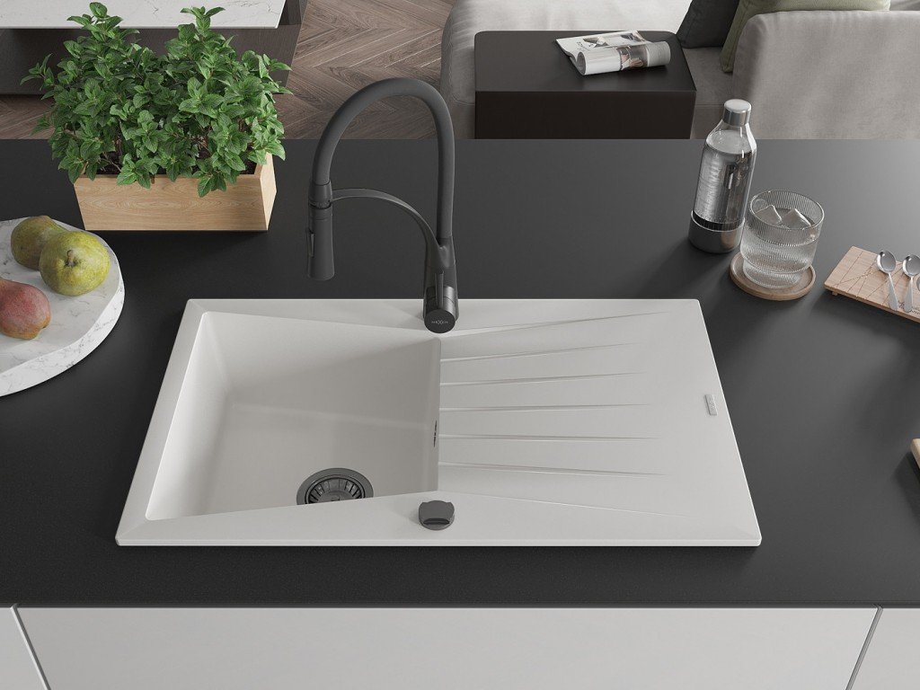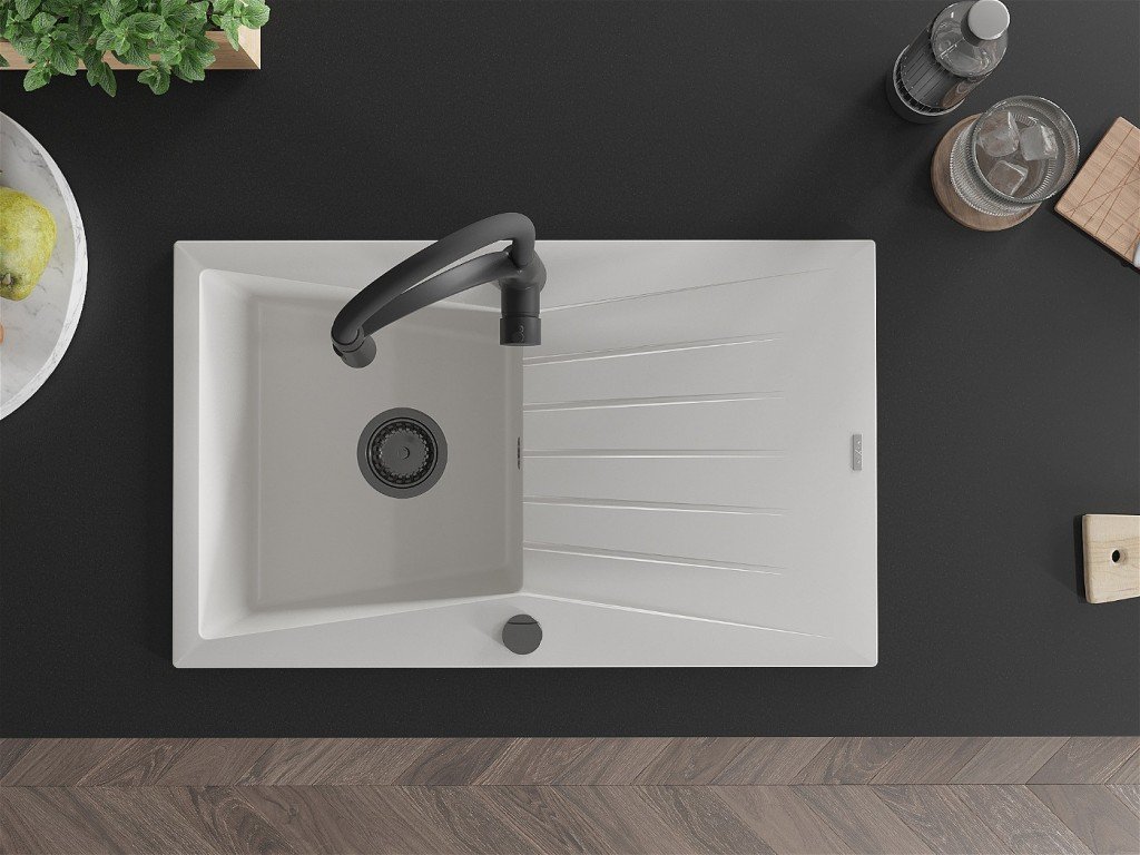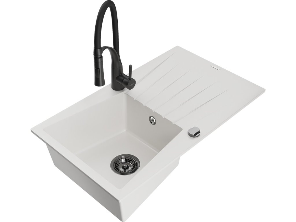 MEXEN/S - Cesar granitový dřez s odkapávačem včetně baterie Aster, bílá 6514-20-73450-70-B