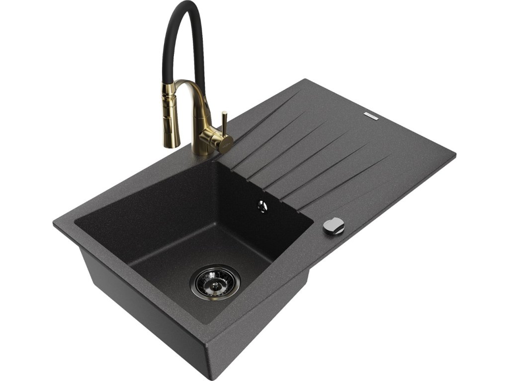 MEXEN/S - Cesar granitový dřez s odkapávačem včetně baterie Aster, černá kropenatá 6514-76-73450-57-B