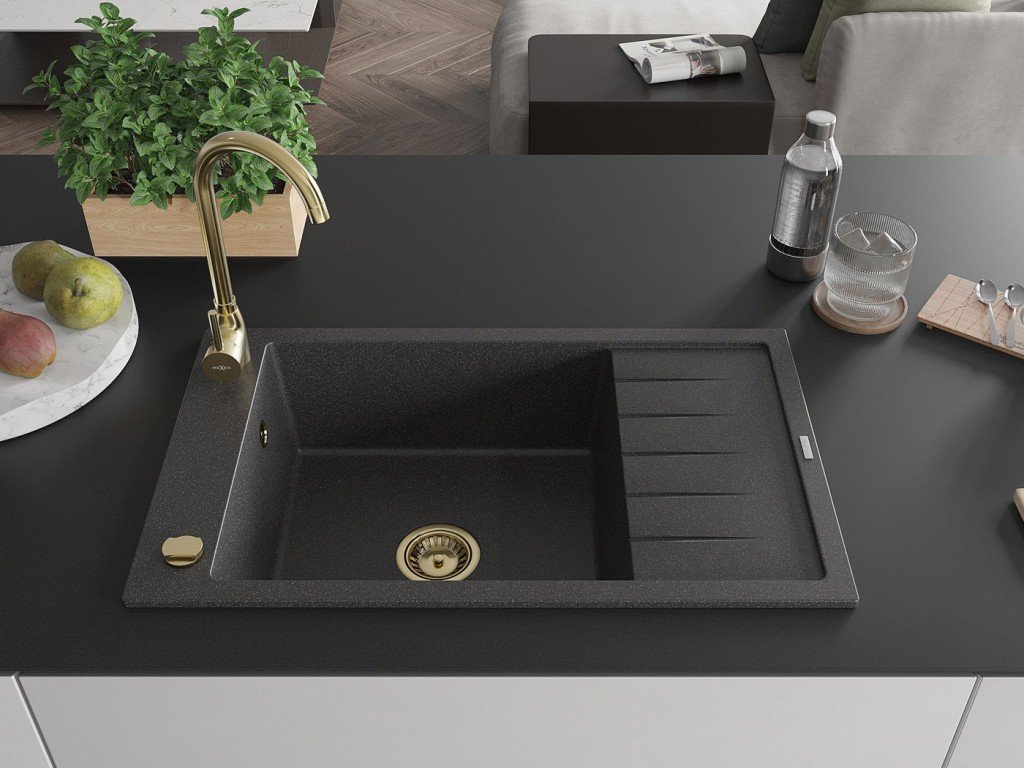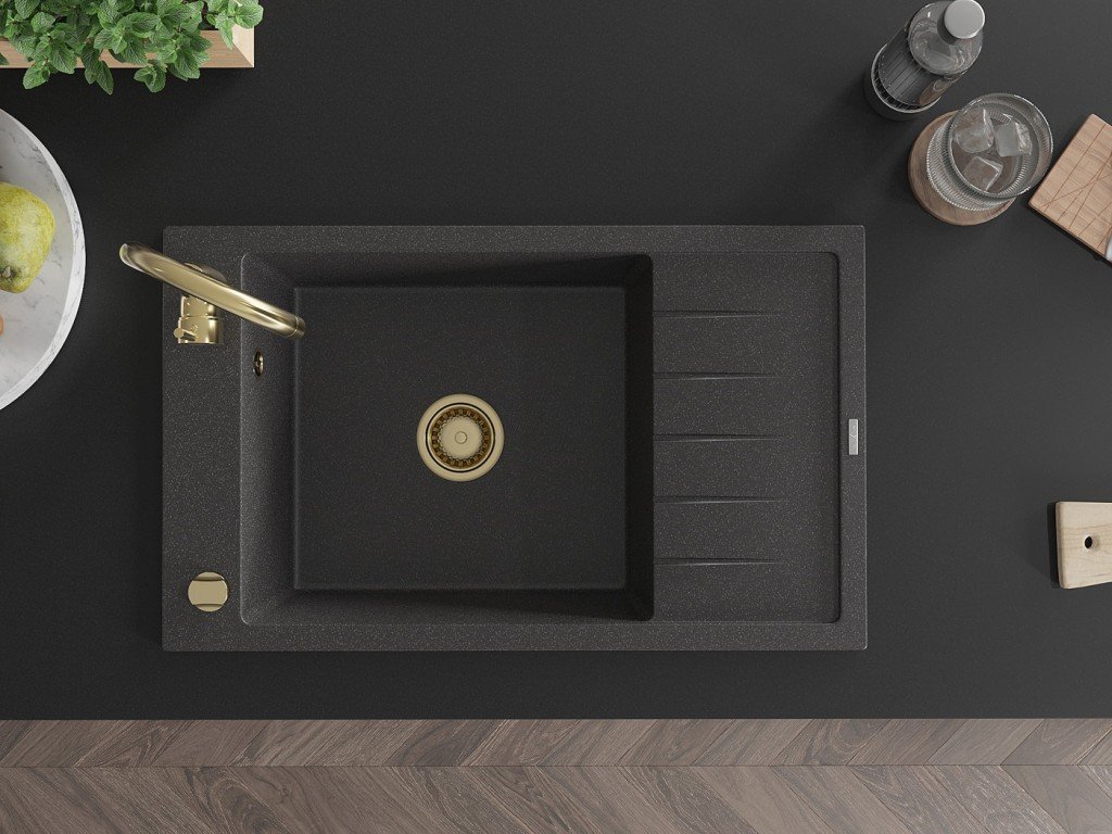 MEXEN/S - Elias granitový dřez 1-miska s odkapávačem 795 x 480 mm, černý kropenatý, zlatý sifon 6511791005-76-G