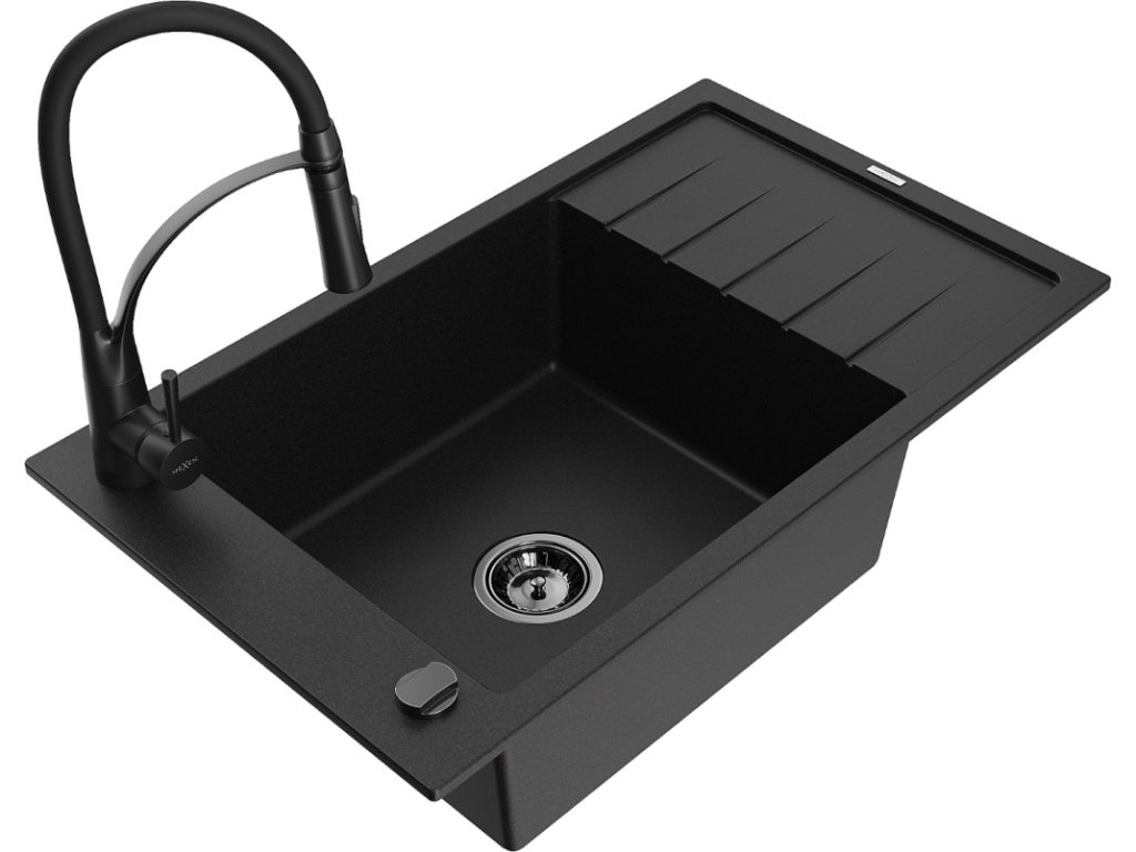 MEXEN/S - Elias granitový dřez 1 s odkapávačem včetně baterie Aster, černá 6511-77-73450-70-B