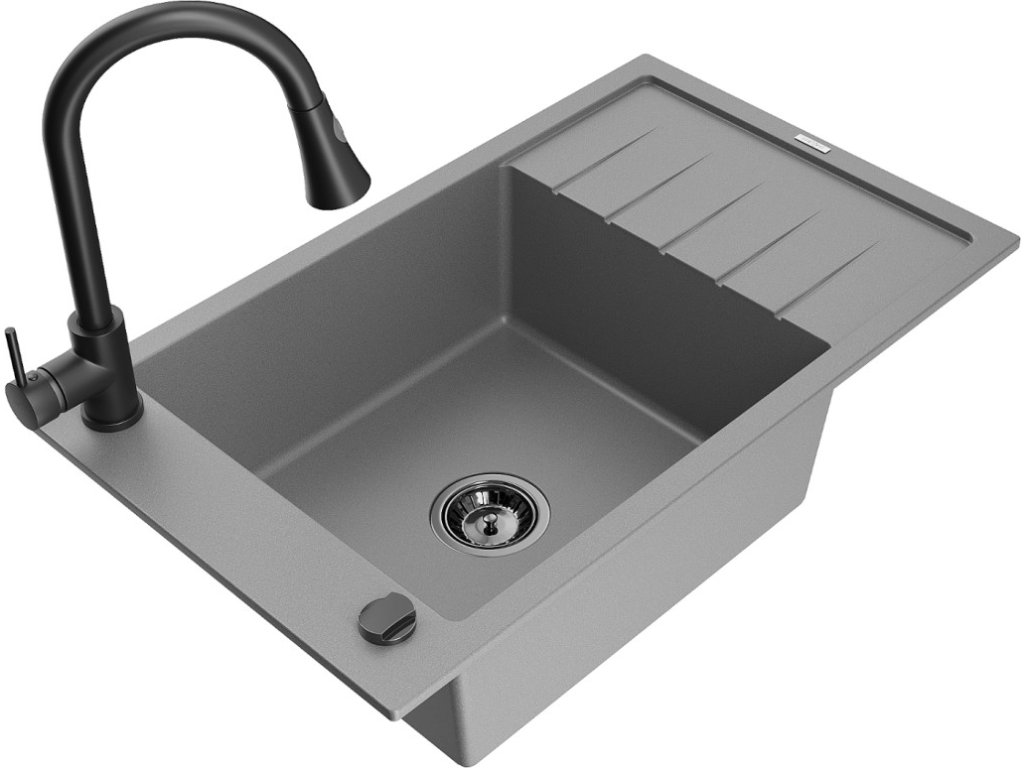 MEXEN/S - Elias granitový dřez 1 s odkapávačem včetně baterie Elia, šedá 6511-71-670101-70-B