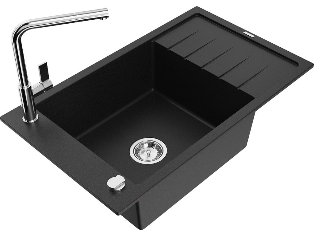 MEXEN/S - Elias granitový dřez 1 s odkapávačem včetně baterie Flora, černá 6511-77-670401-00