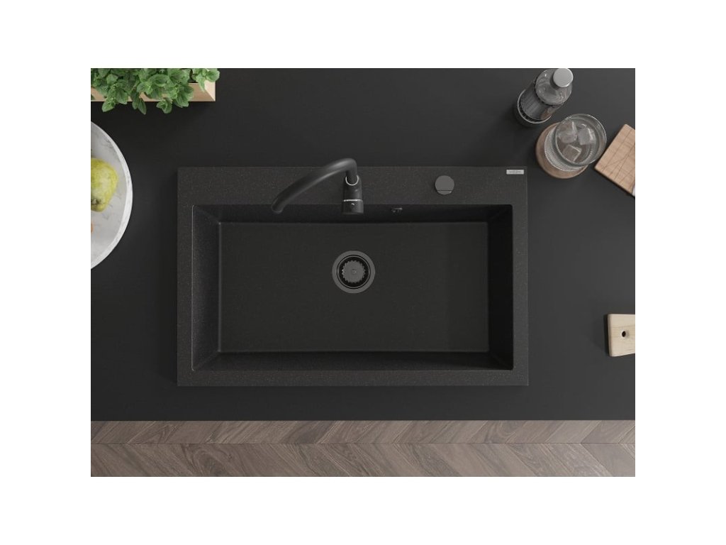 MEXEN/S - Elix granitový dřez 1-miska 800 x 500 mm, černá/stříbrná metalik, sifon černá 6527801005-73-B