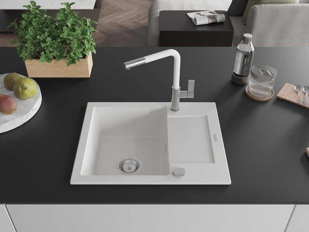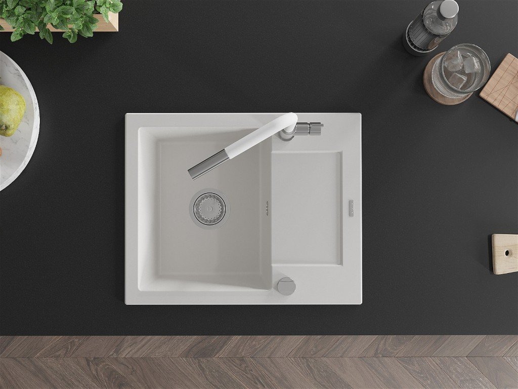 MEXEN/S - Enzo granitový dřez 1-miska s odkapávačem včetně baterie Flora, bílá 6506-20-670401-02