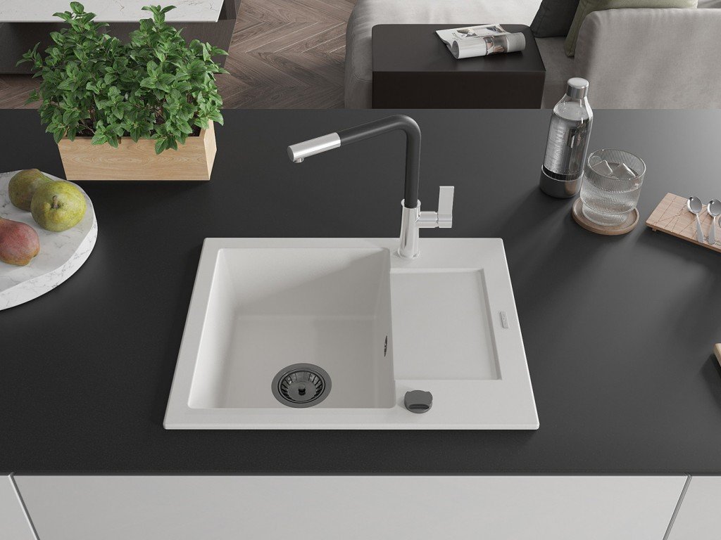MEXEN/S - Enzo granitový dřez 1-miska s odkapávačem včetně baterie Flora, bílá 6506-20-670401-07-B