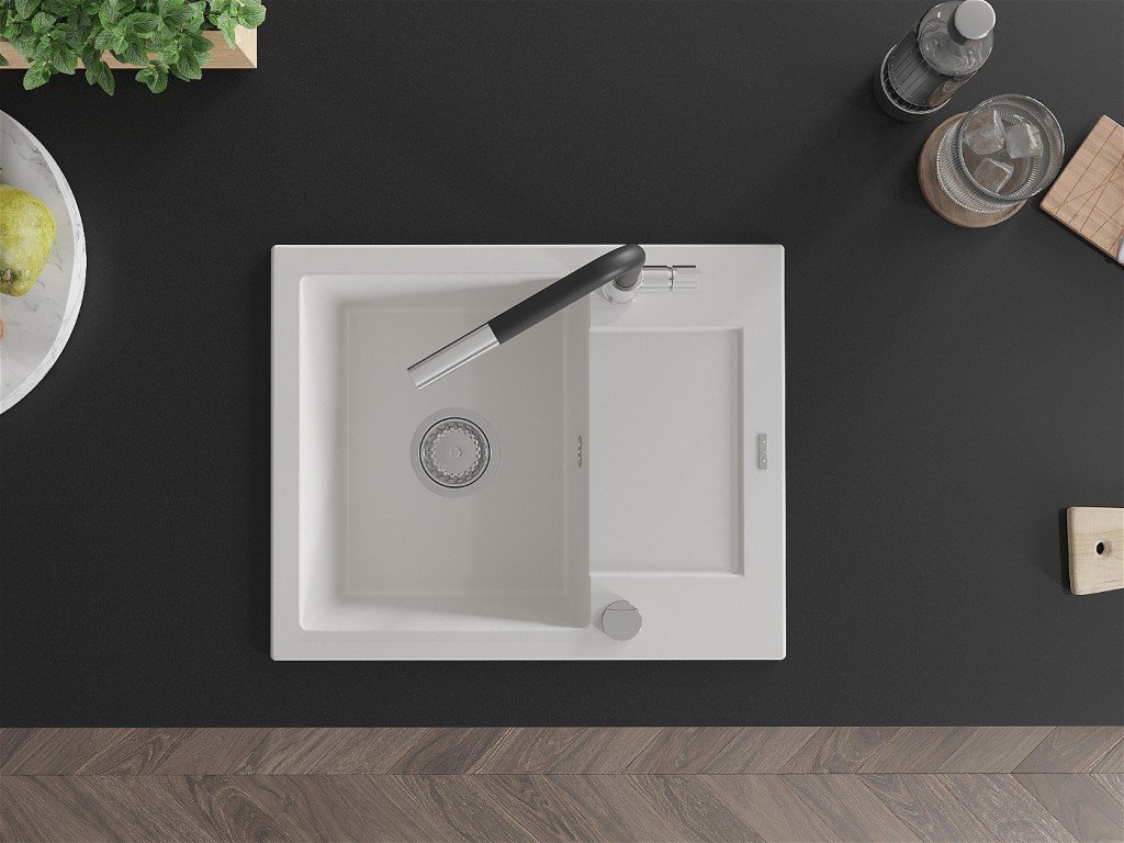 MEXEN/S - Enzo granitový dřez 1-miska s odkapávačem včetně baterie Flora, bílá 6506-20-670401-07