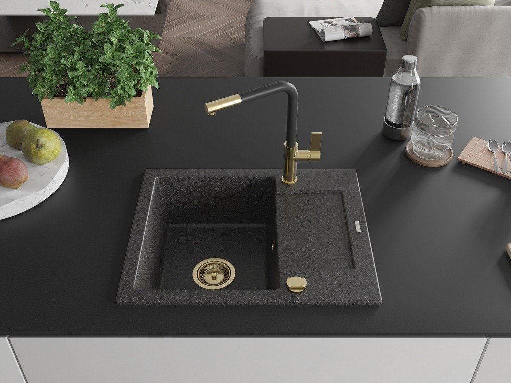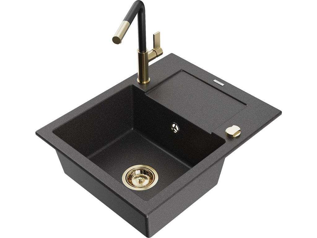 MEXEN/S - Enzo granitový dřez 1-miska s odkapávačem včetně baterie Flora, černá kropenatá 6506-76-670401-57-G