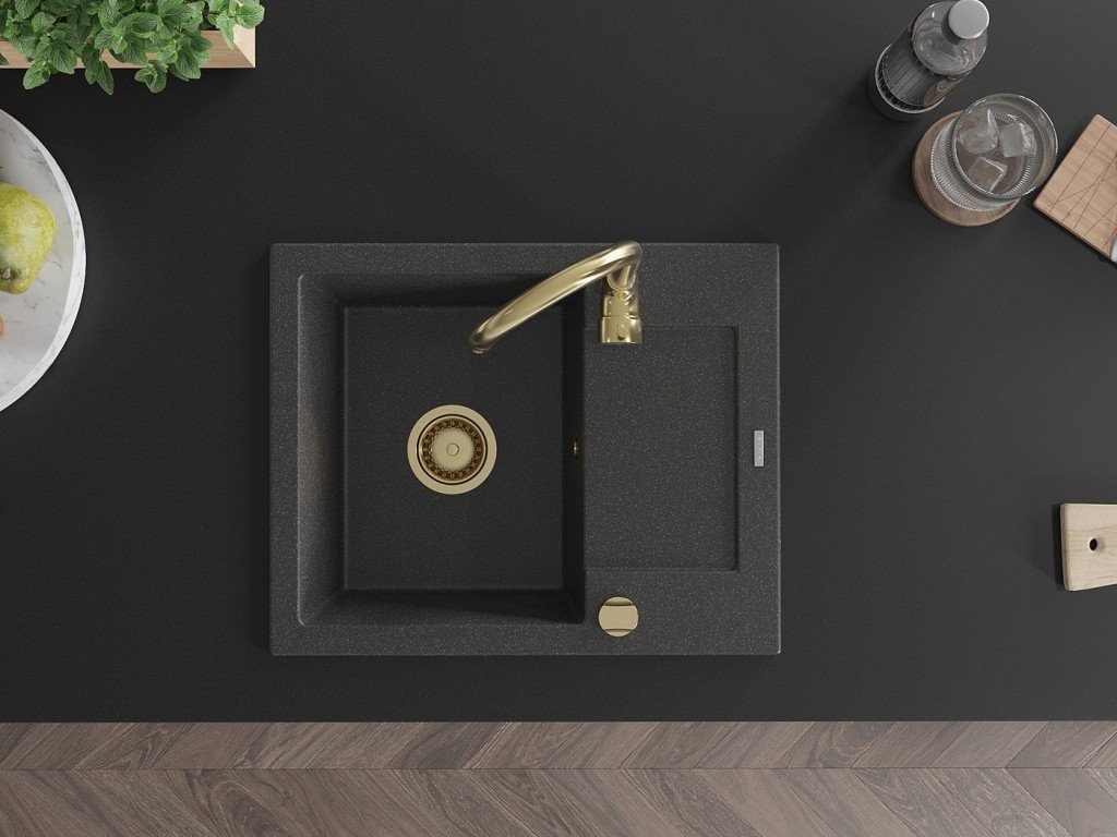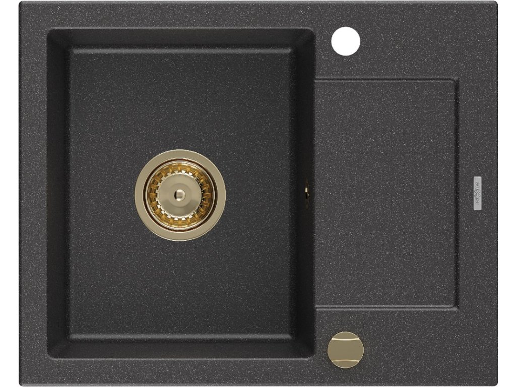 MEXEN/S - Enzo granitový dřez 1 s odkapávačem 576x465 mm, černá kropenatá,+ zlatý sifon 6506571005-76-G