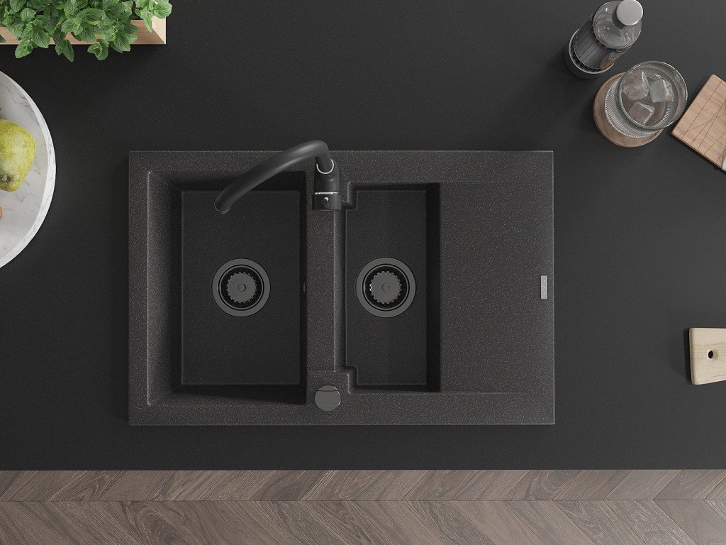 MEXEN/S - Bruno granitový dřez s odkapávačem včetně baterie Aster, černá/stříbrná metalik 6513-73-73450-07-B