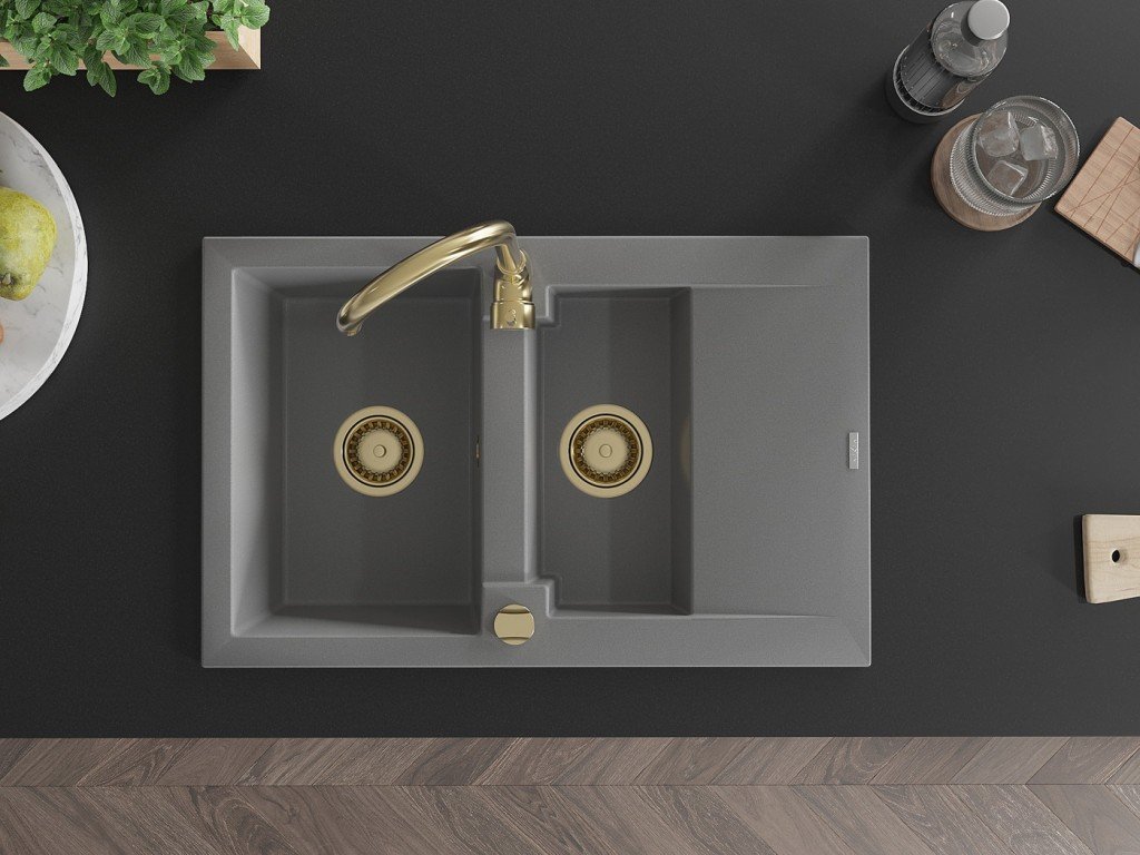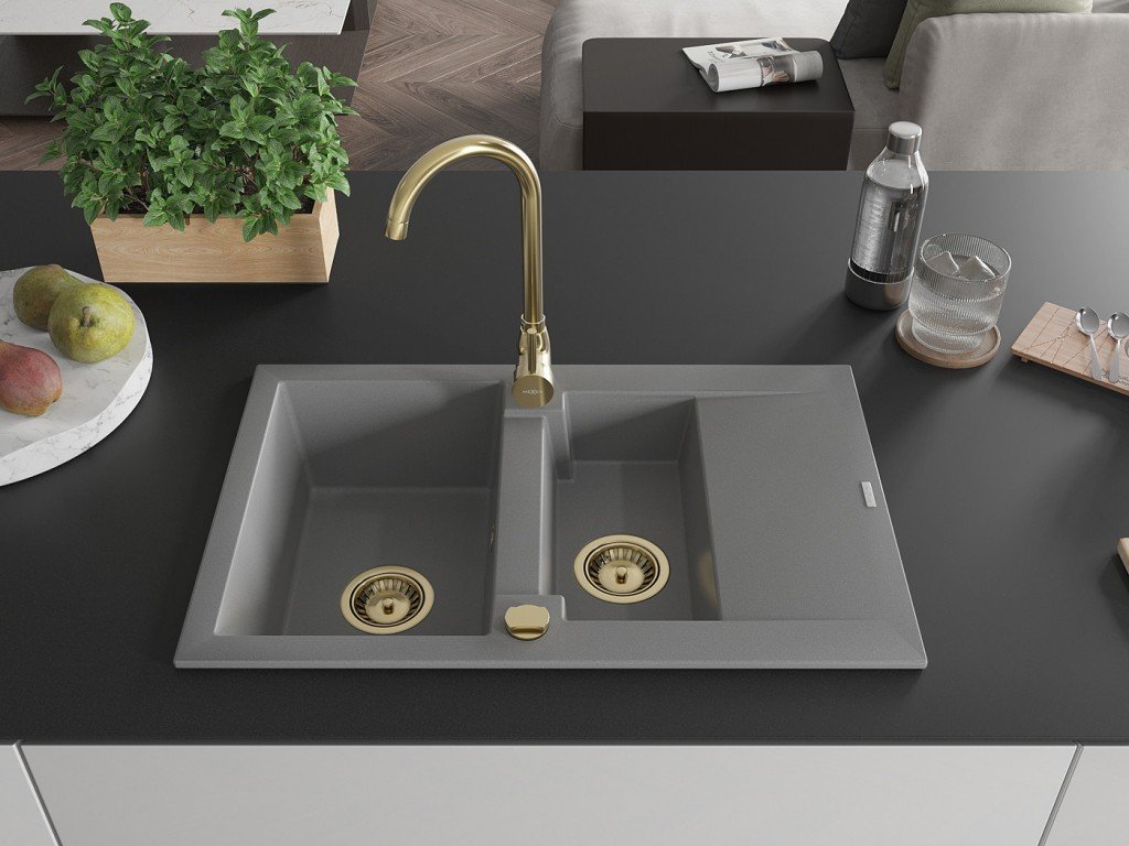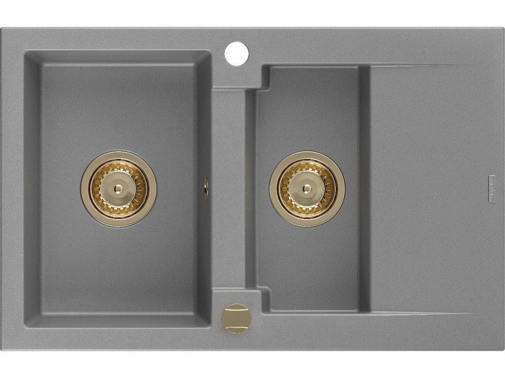 MEXEN/S - Gaspar granitový dřez 1.5 s odkapávačem 737 x 475 mm, šedý, zlatý sifon 6507731505-71-G