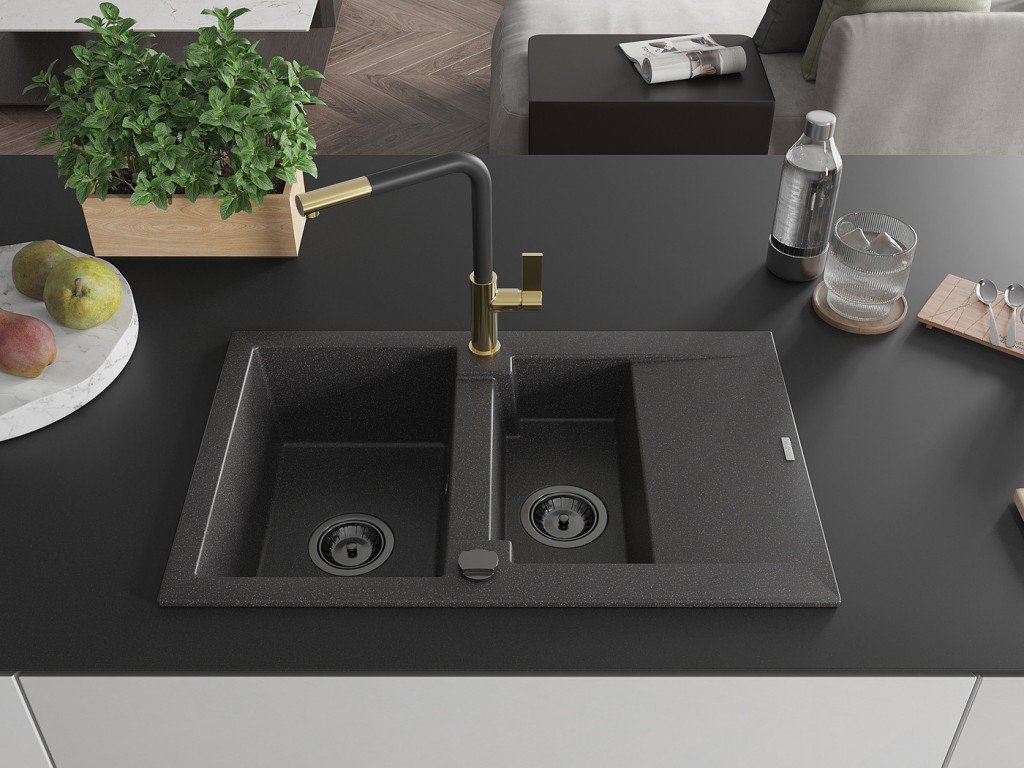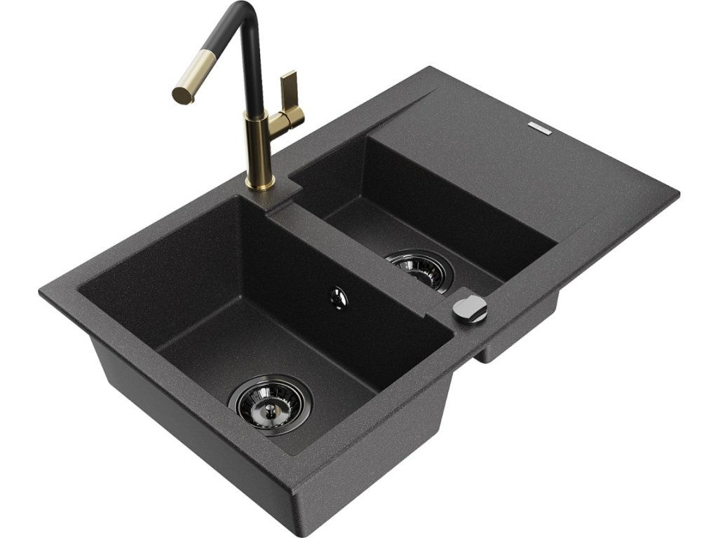 MEXEN/S - Gaspar granitový dřez 1.5 s odkapávačem včetně baterie Flora, černá kropenatá 6507-76-670401-57-B