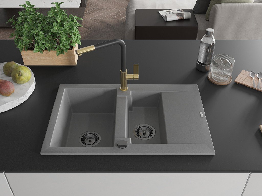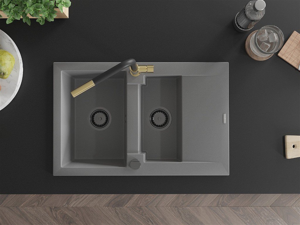 MEXEN/S - Gaspar granitový dřez 1.5 s odkapávačem včetně baterie Flora, šedá 6507-71-670401-57-B