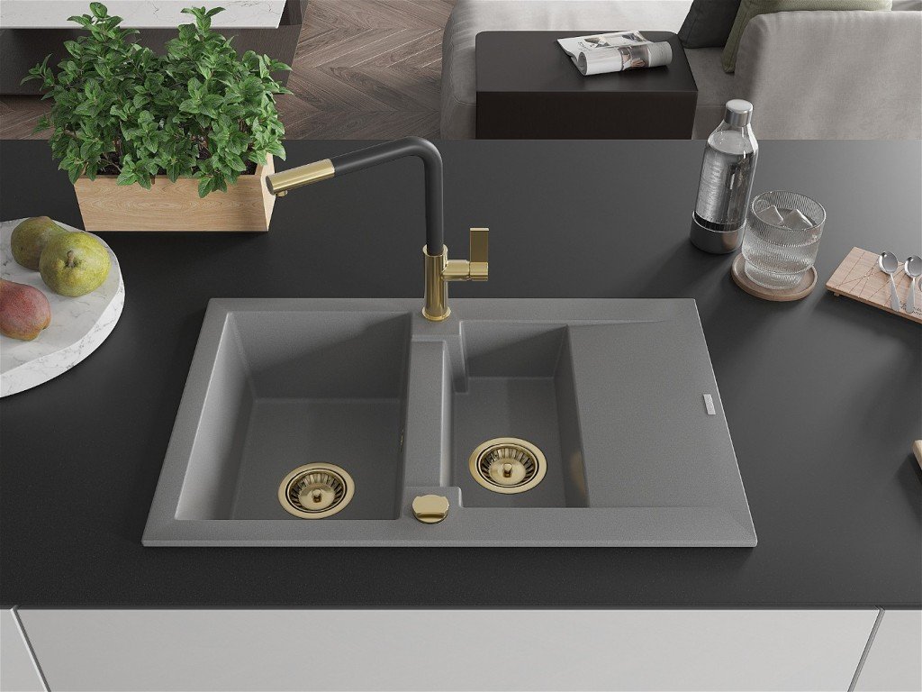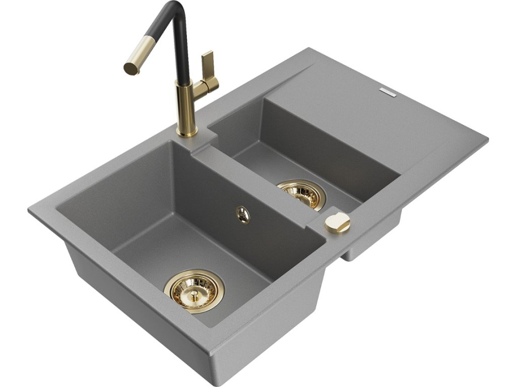 MEXEN/S - Gaspar granitový dřez 1.5 s odkapávačem včetně baterie Flora, šedá 6507-71-670401-57-G