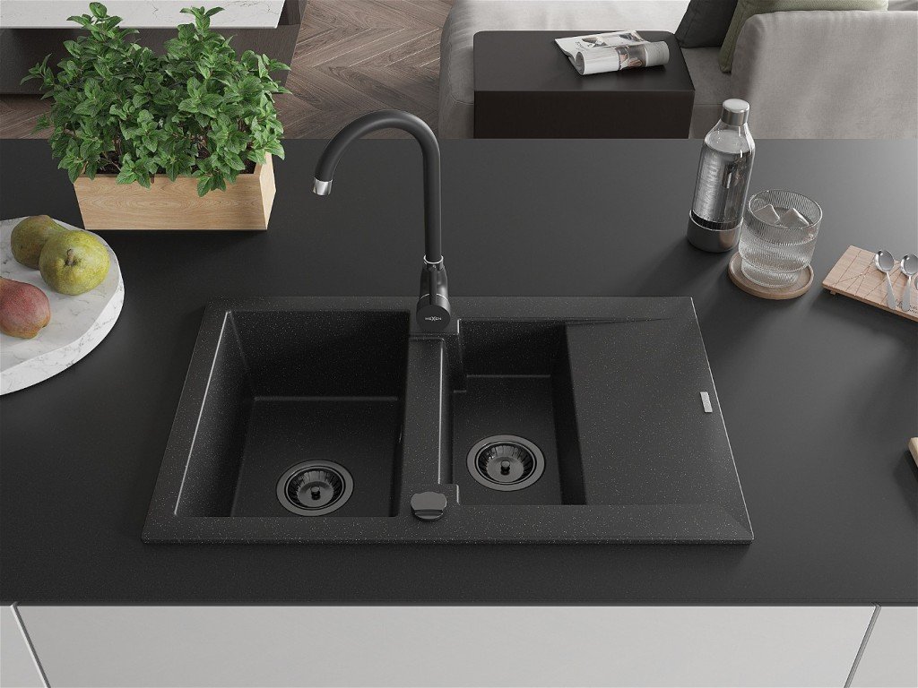MEXEN/S - Gaspar granitový dřez 1.5 s odkapávačem včetně baterie Telma, černá/stříbrná 6507-73-670200-70-B
