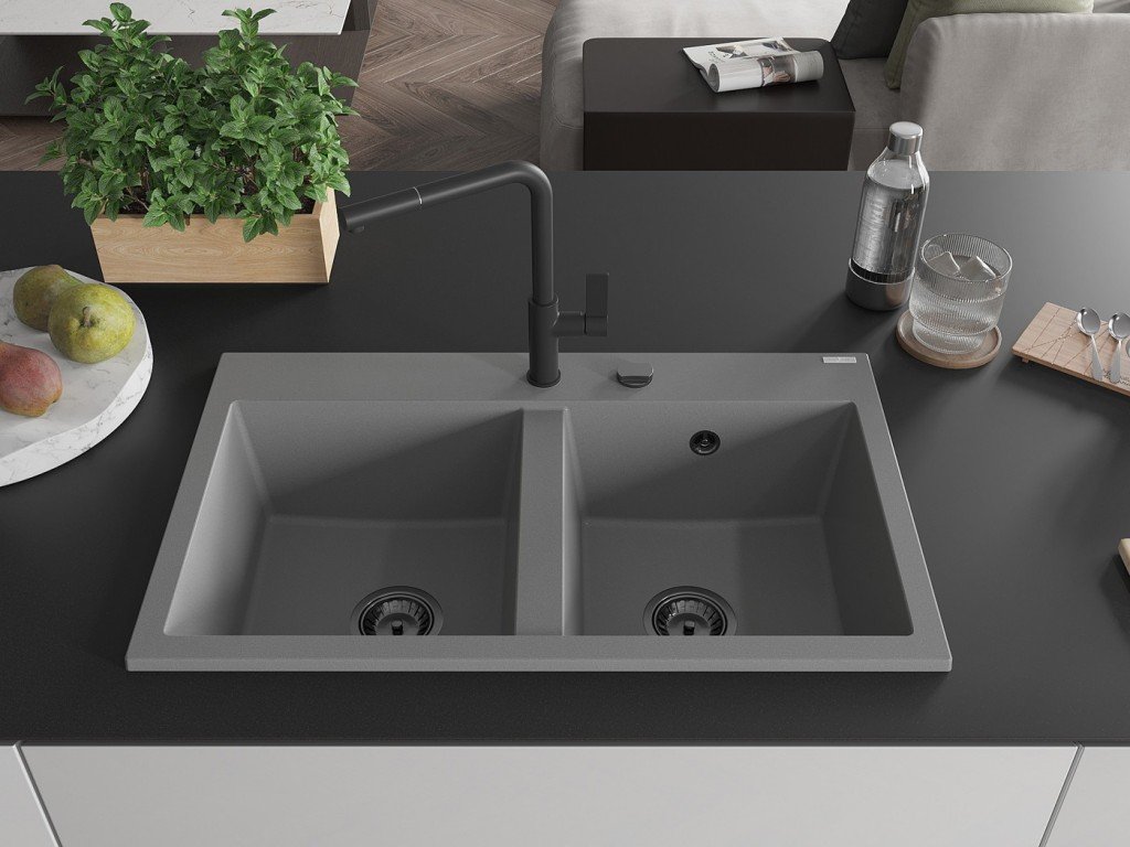 MEXEN/S - Hektor granitový dřez 2-bowl 800 x 480 mm, šedá, černý sifon 6521802000-71-B