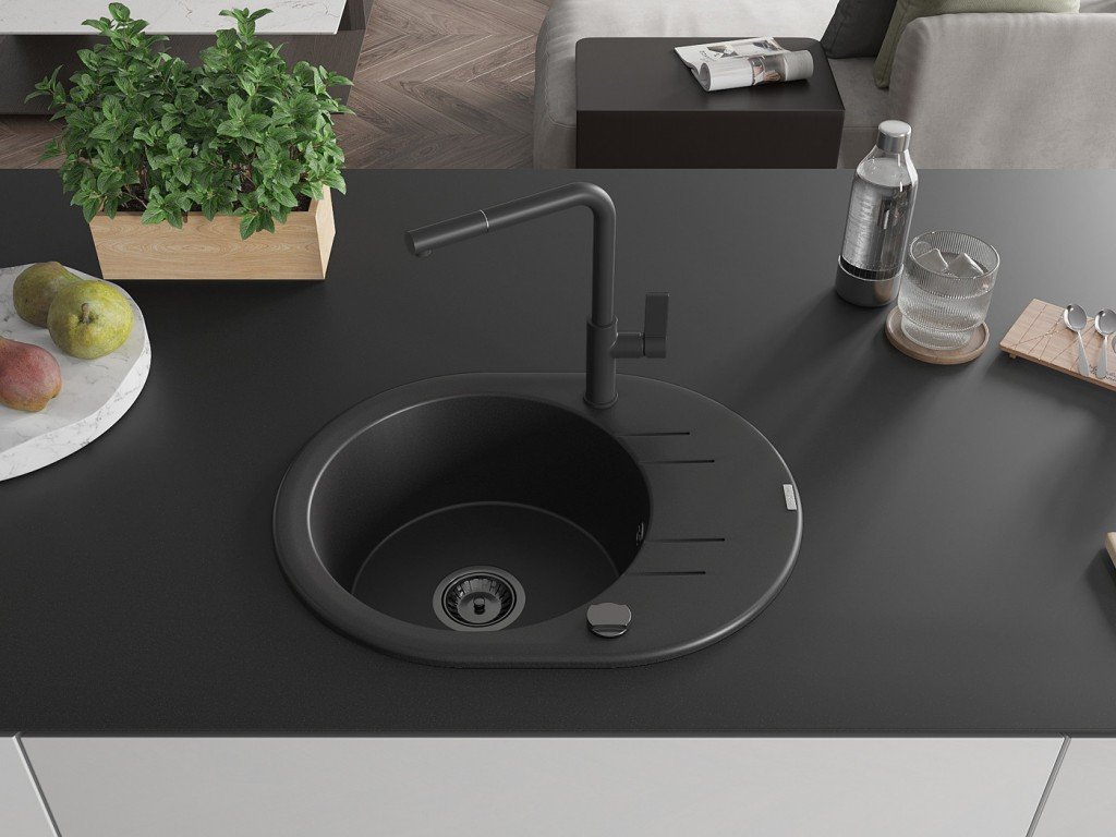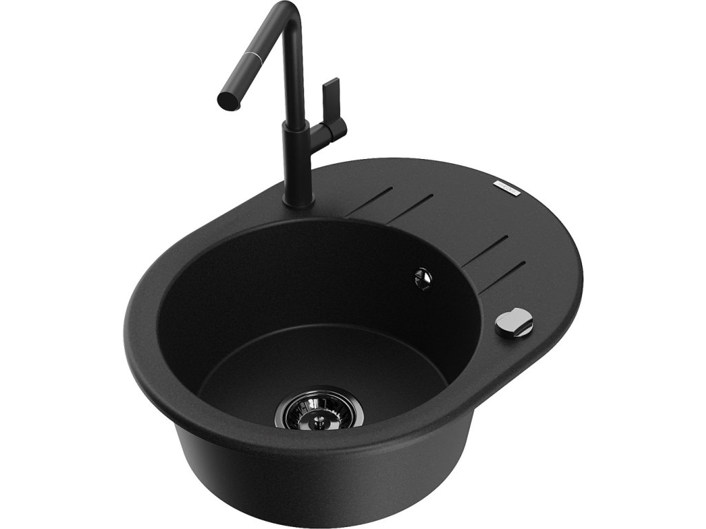 MEXEN/S - Kevin granitový dřez 1-miska s odkapávačem včetně baterie Flora, černá 6517-77-670401-70-B