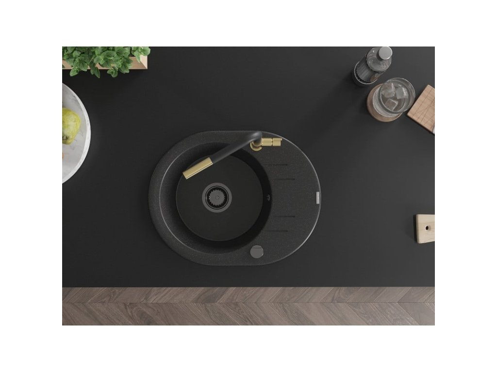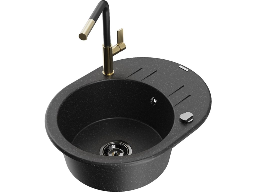 MEXEN/S - Kevin granitový dřez 1-miska s odkapávačem včetně baterie Flora, černá/srebrny metalik 6517-73-670401-57-B