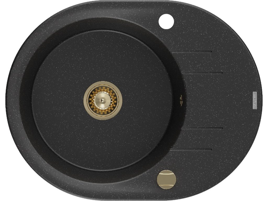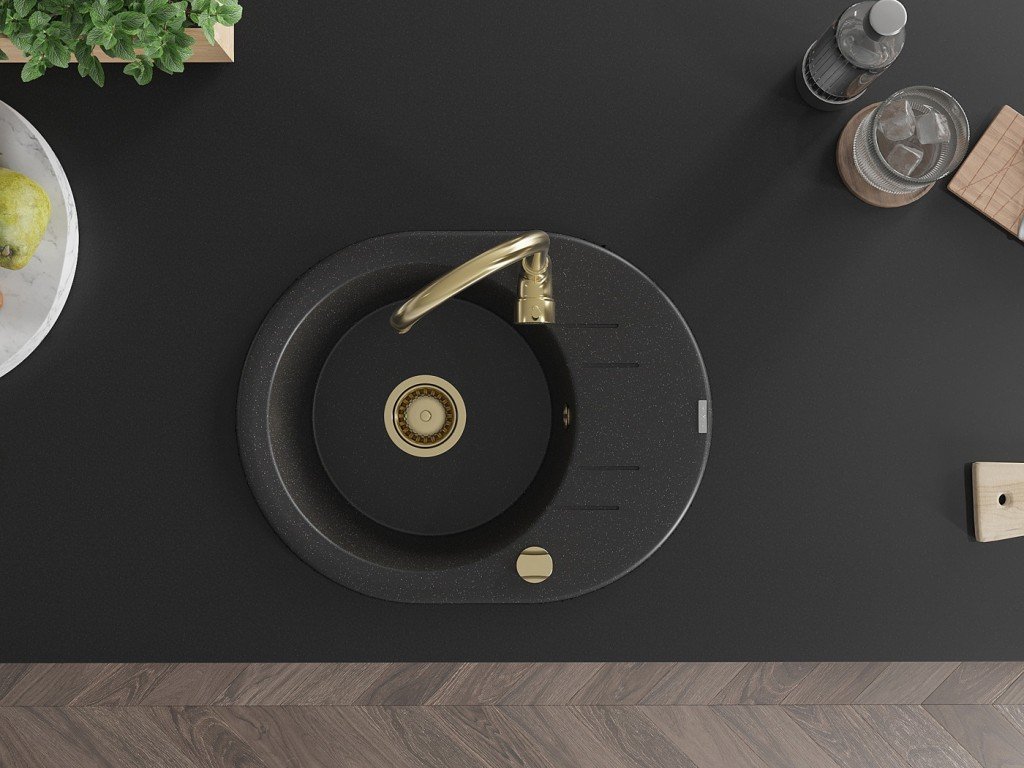 MEXEN/S - Kevin granitový dřez 1 s odkapávačem 586x458 mm, černý/stříbro metalik + zlatý sifon 6517581005-73-G