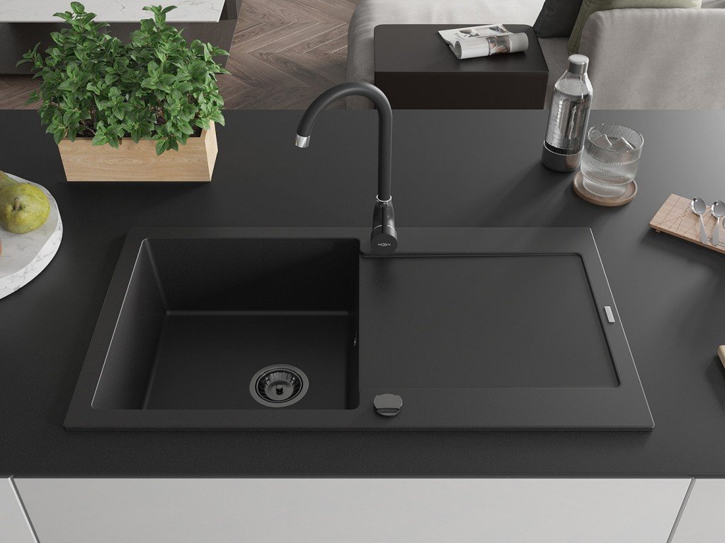 MEXEN/S - Leo granitový dřez 1-miska s odkapávačem 900 x 500 mm, černý, černý sifon 6501901010-77-B