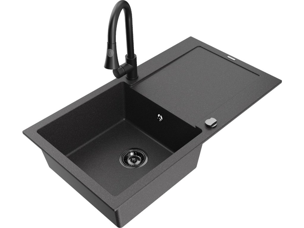 MEXEN/S - Leo granitový dřez 1-miska s odkapávačem včetně baterie Elia, černá kropenatá 6501-76-670101-70-B