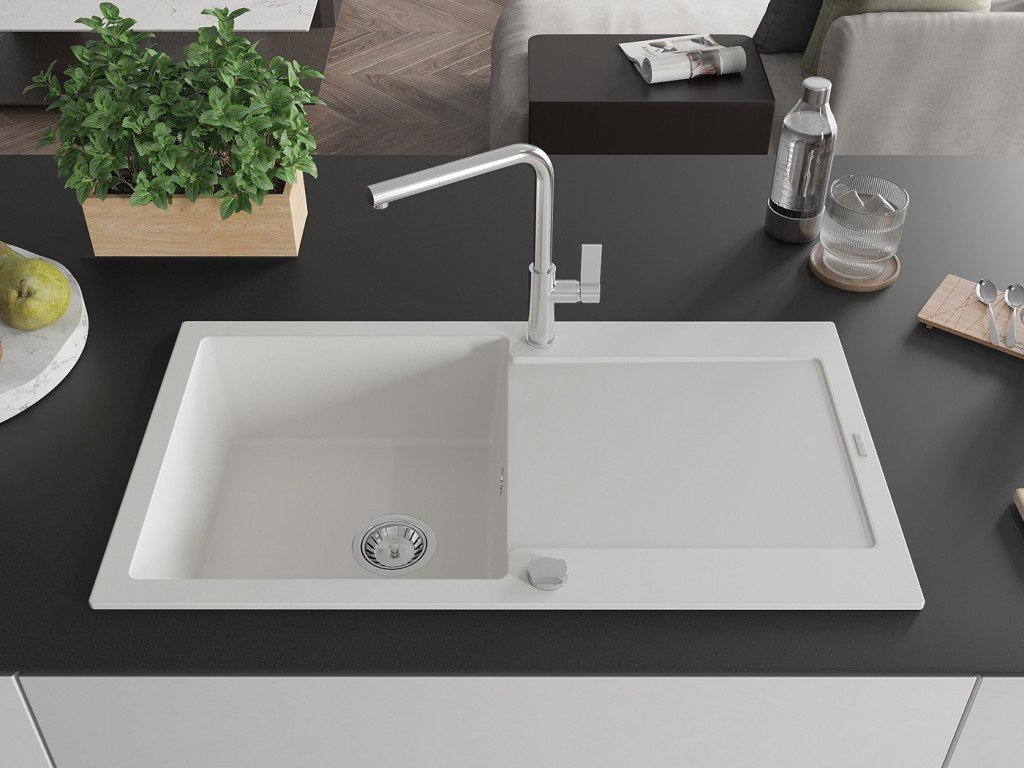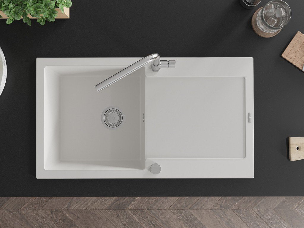 MEXEN/S - Leo granitový dřez 1 s odkapávačem včetně baterie Flora, bílá 6501-20-670401-00