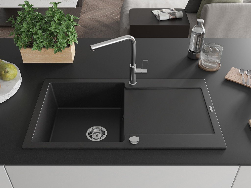MEXEN/S - Leo granitový dřez 1 s odkapávačem včetně baterie Flora, černá 6501-77-670401-00