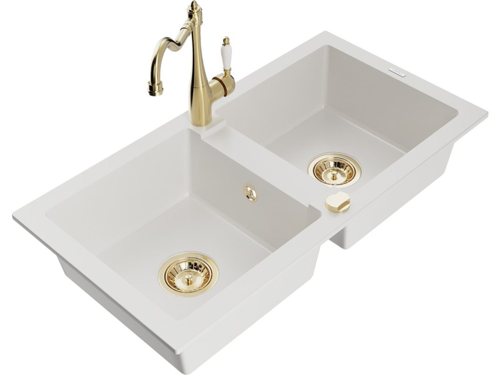 MEXEN/S - Mario granitový dřez 2-bowl včetně baterie Carla, bílá 6504-20-670700-50