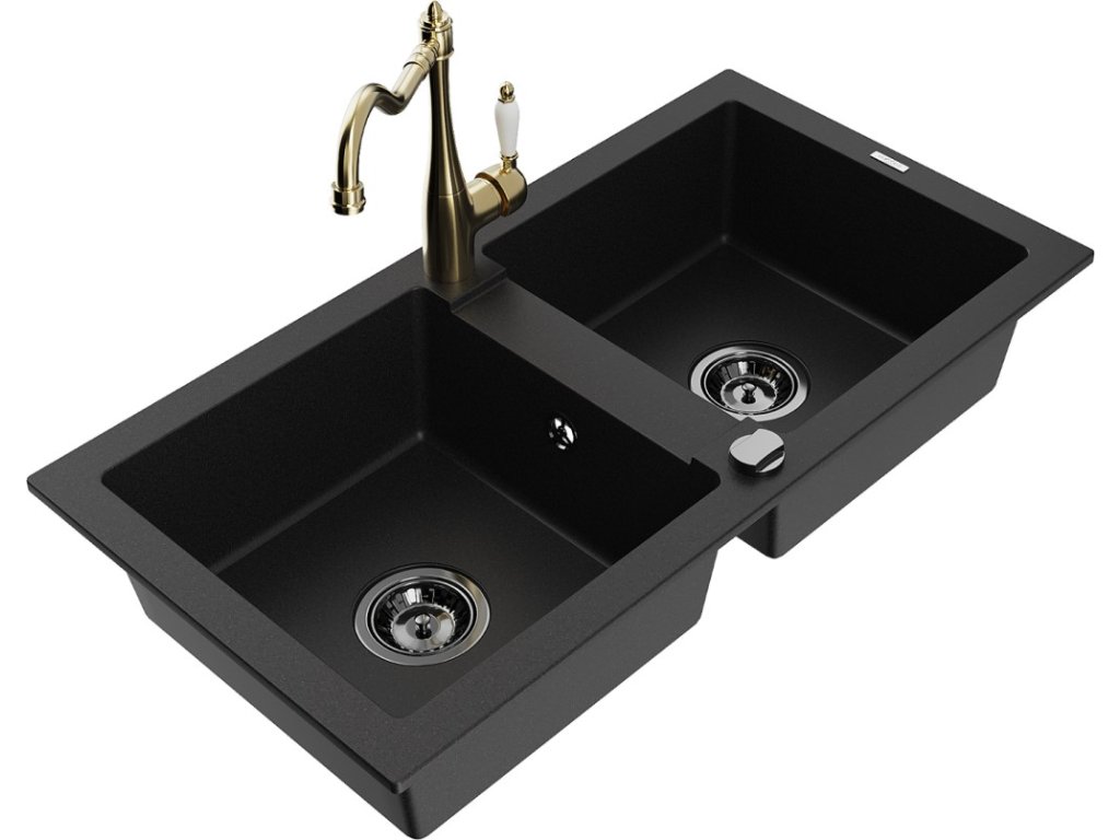 MEXEN/S - Mario granitový dřez 2-bowl včetně baterie Carla, černá 6504-77-670700-50-B